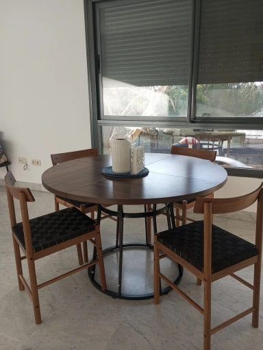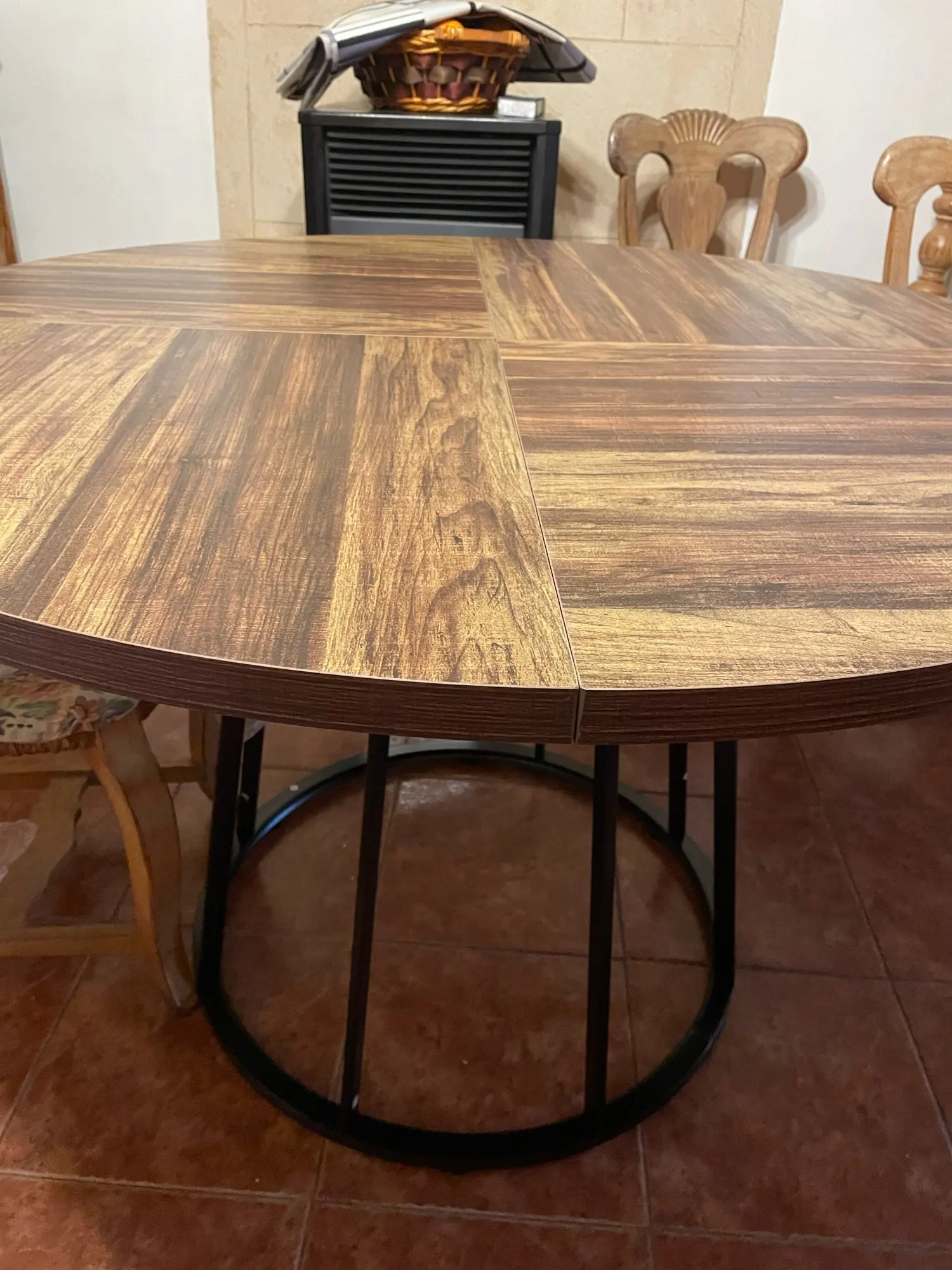 Circle Kitchen Table: Measuring 47.2" W * 47.2" D * 29.9" H, this round table provides ample space for comfortable seating during mealtime. Also, this dinner table features a smooth brown finish tabletop and a black metal base, creating a chic and sophisticated look for your kitchen dining room.