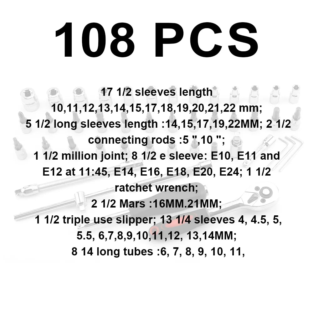 108pcs Socket Wrench Set Car Repair Tools Ratchet Spanner Wrench Set Ratchet Spanner Screwdriver Bits