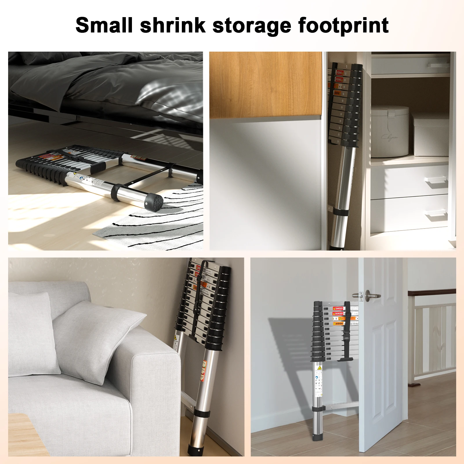 Multi-Scene Application: Changing light bulbs and going up to the attic indoors, or repairing roofs or climbing into RVs outdoors, our aluminum retractable ladders can be used in any scenario where you need a ladder.