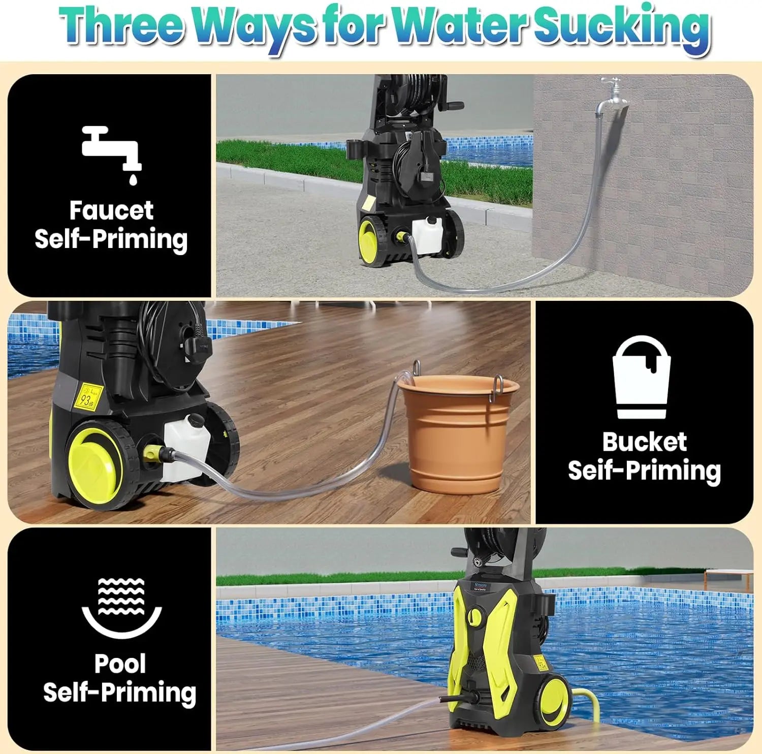 [On Board Hose Reel]: 32ft electric high power washer hose is long enough for the projects you need it for, the built in on-board hose reel to conveniently protect and helps prevent kinks in the high-presure hose and makes winding or unwinding a simple task.