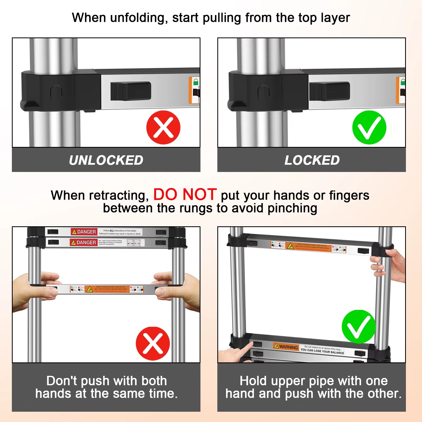 Safety of Use: The high quality construction of the telescoping ladder ensures that each part retracts safely. Smart locking pins hold the parts in place and prevent sliding, and the ladder will retract smoothly and slowly.
