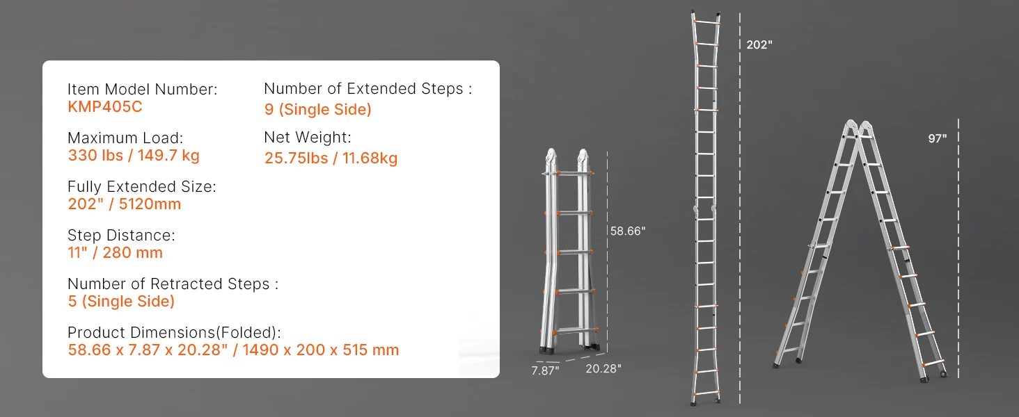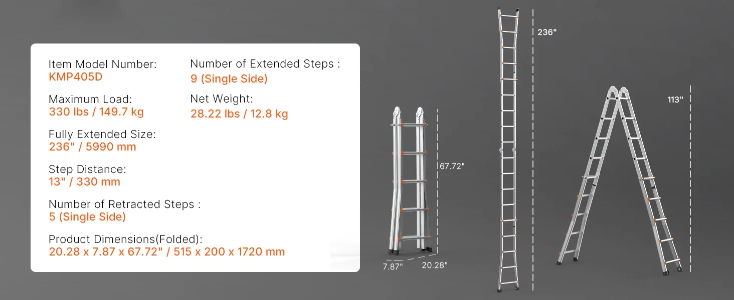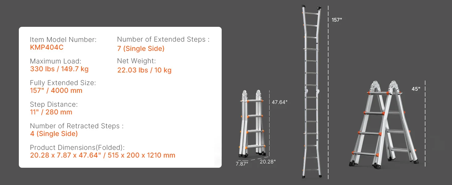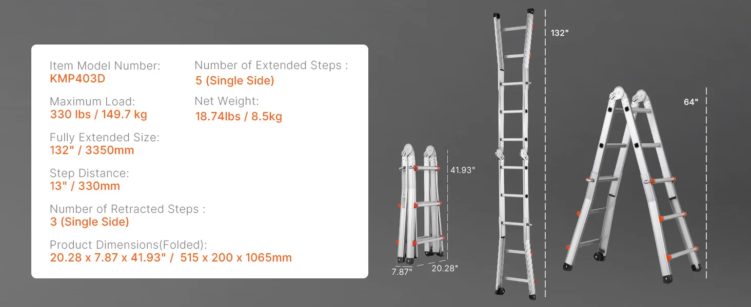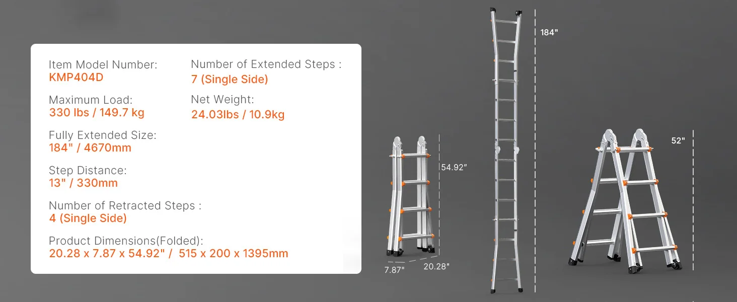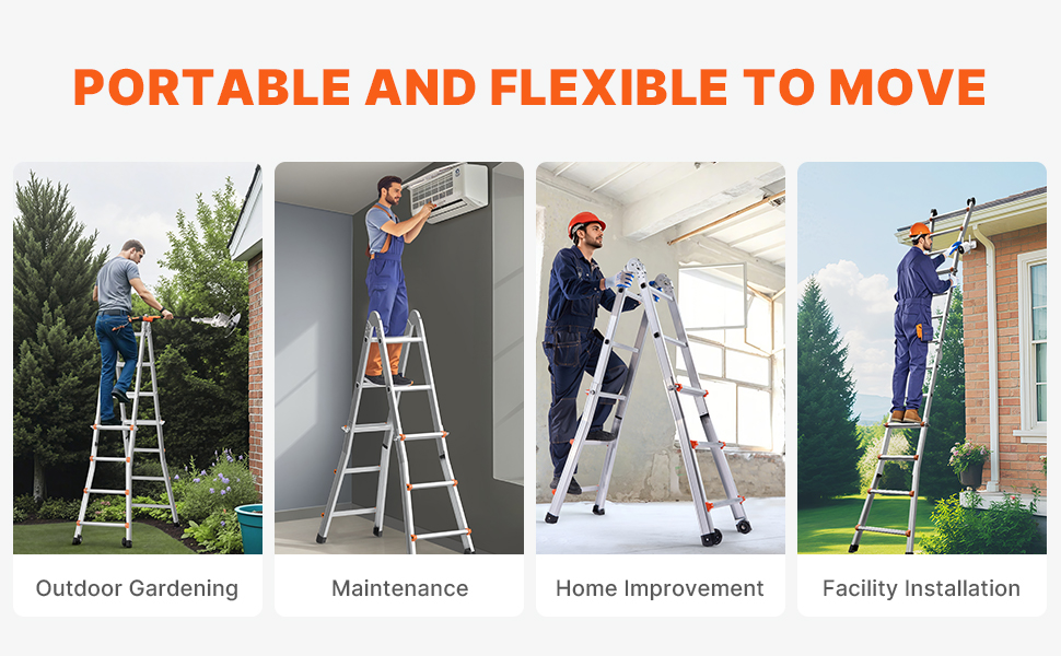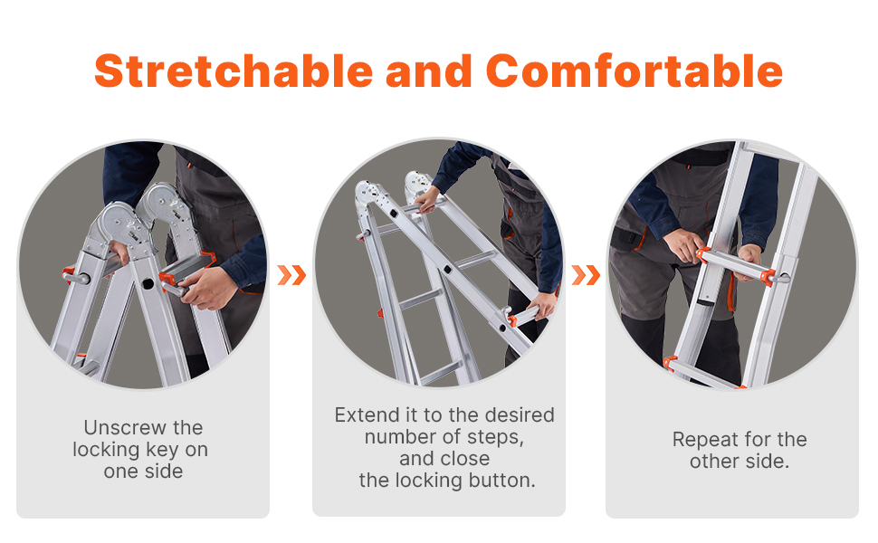 Versatile Ladder: This telescoping a frame ladder adapts to various needs, easily transitioning between different configurations. With extendable legs reaching up to 180° and a maximum height of 9.5ft / 2880 mm, it’s perfect for maintenance or attic cleaning.