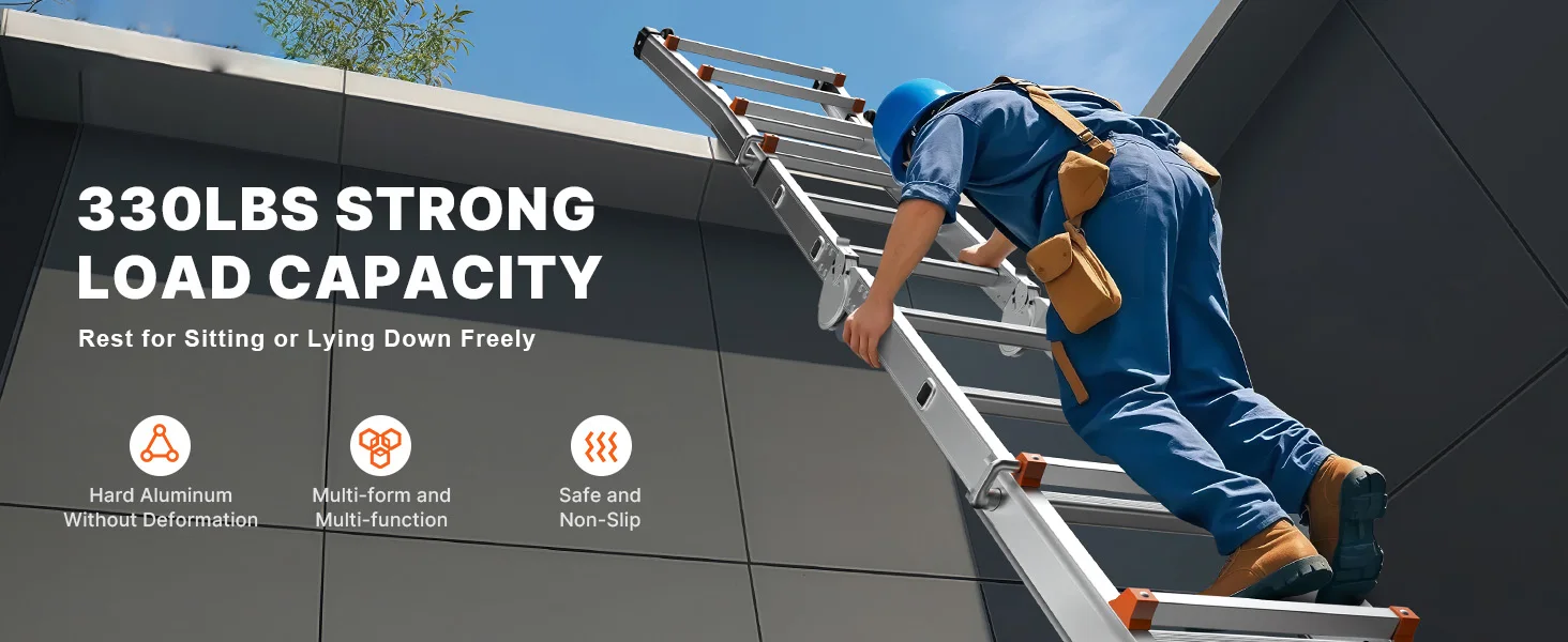 Safe A-Frame Ladder: Designed with an A-frame structure for enhanced stability, this extension ladder supports a weight capacity of up to 330 lbs. It requires no assembly, allowing for immediate use, and its non-slip design ensures peace of mind while working at heights.