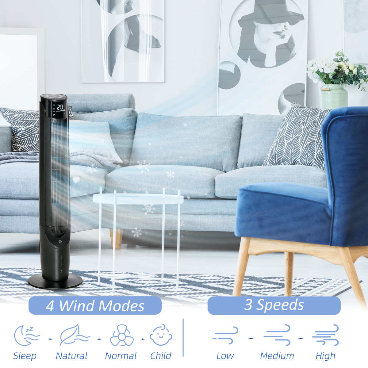 Experience a personalized cooling environment with an impressive 12 settings, including low, medium, and high speeds, alongside modes such as normal, natural, sleep, and child mode. To enhance your convenience, our air cooler also comes with a 12-hour timer that operates in 1-hour intervals, allowing you to enjoy a peaceful night’s sleep without any worries.