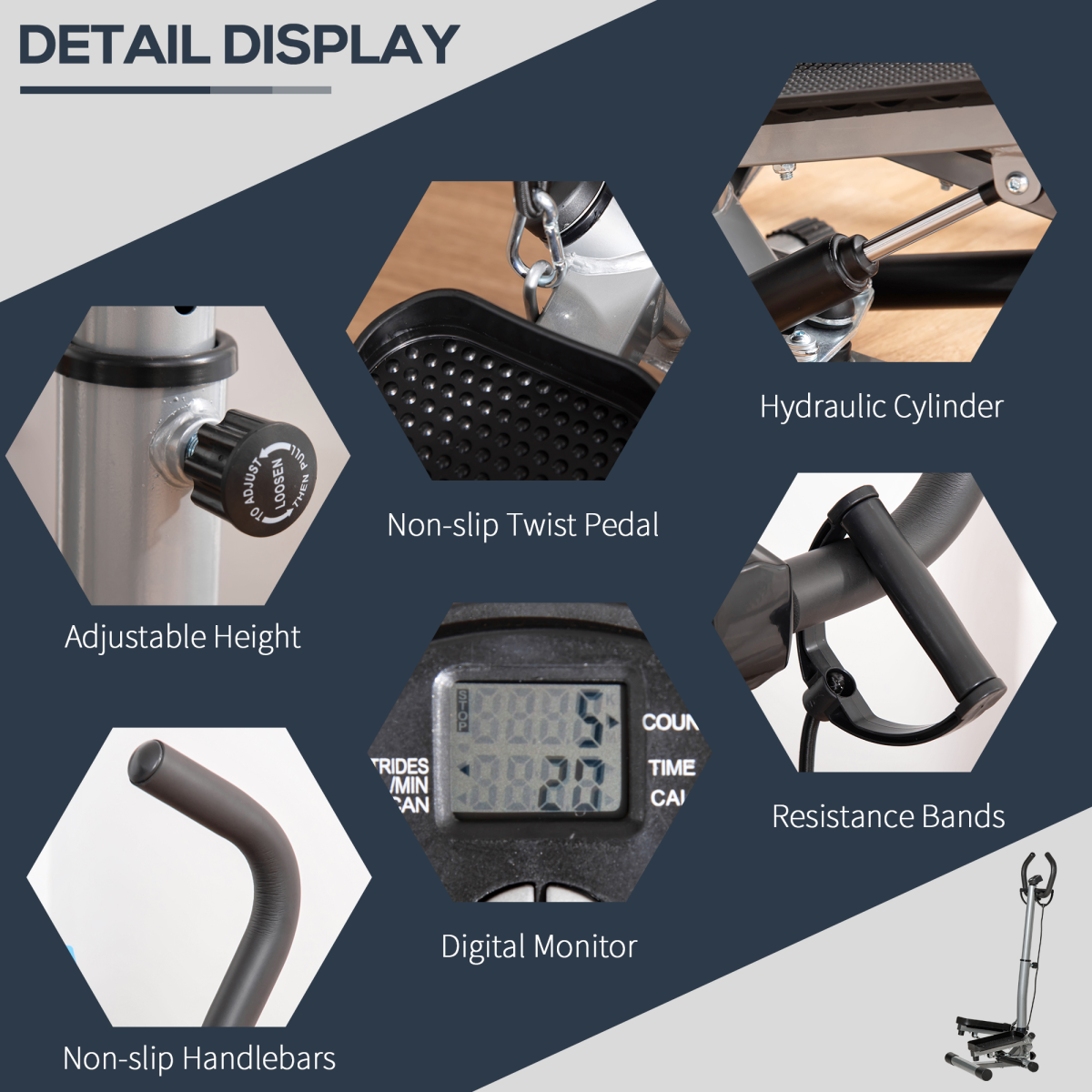 Elevate your fitness routine with the Adjustable Twist Stepper. This innovative step machine is designed to tone and strengthen your glutes and thighs while providing a full-body workout. The adjustable handlebar enhances your workout experience, allowing you to target specific muscle groups effectively. The stepping pedals engage your calves, buttocks, thighs, and hips for a comprehensive workout. With non-slip foot pedals and cushioned foam handlebars, you can enjoy stability and comfort while exercising. Additionally, the built-in LCD monitor tracks your workout progress by displaying time, calories burned, and step count, helping you stay motivated. Experience a fun and efficient way to stay fit in the comfort of your home or office!