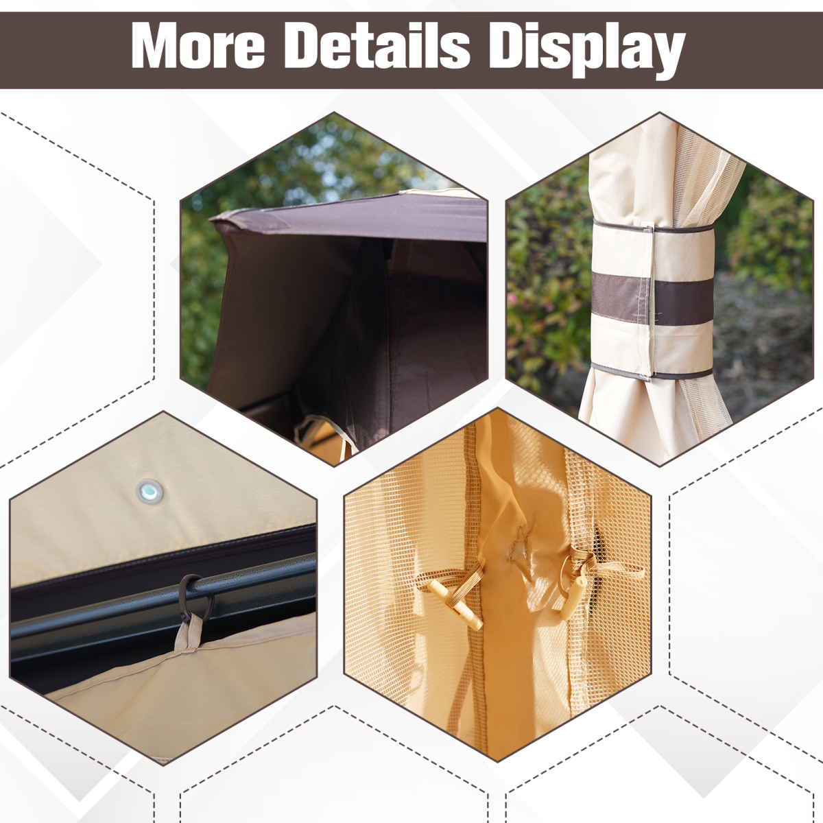 2-Tier Vented Canopy: Our gazebo boasts a striking beige and brown contrasting color scheme. The double-layer polyester roof with PU coating offers superior protection against rain and UV rays. The vented roof design aids in heat and wind reduction, ensuring a comfortable space no matter the weather. Built-in grommets throughout the fabric facilitate proper water drainage, maintaining a dry and enjoyable environment.