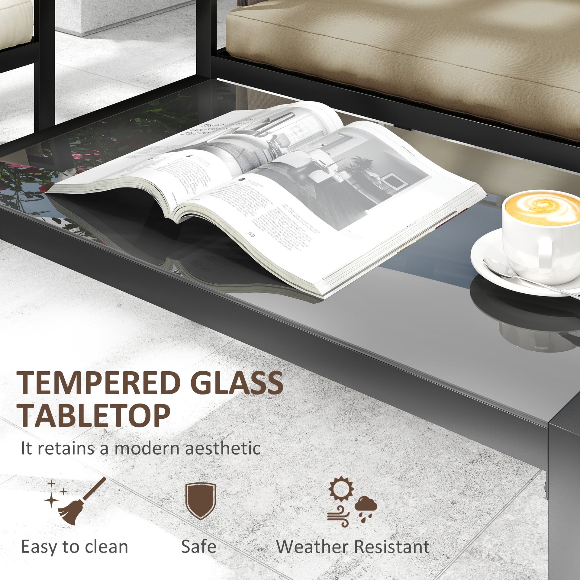 Each piece is built with a sturdy steel frame that guarantees durability and stability. The thickly padded cushions on the seats and backs provide an exceptional level of comfort, making it an inviting place to relax and unwind. The set is completed with a sleek tempered glass-top coffee table, adding a modern touch to your outdoor setup.
