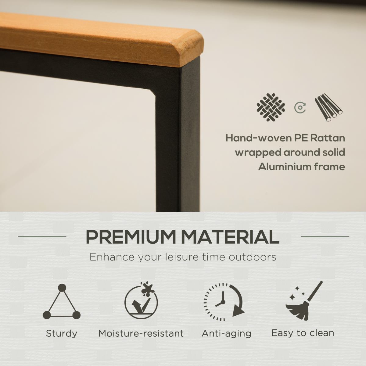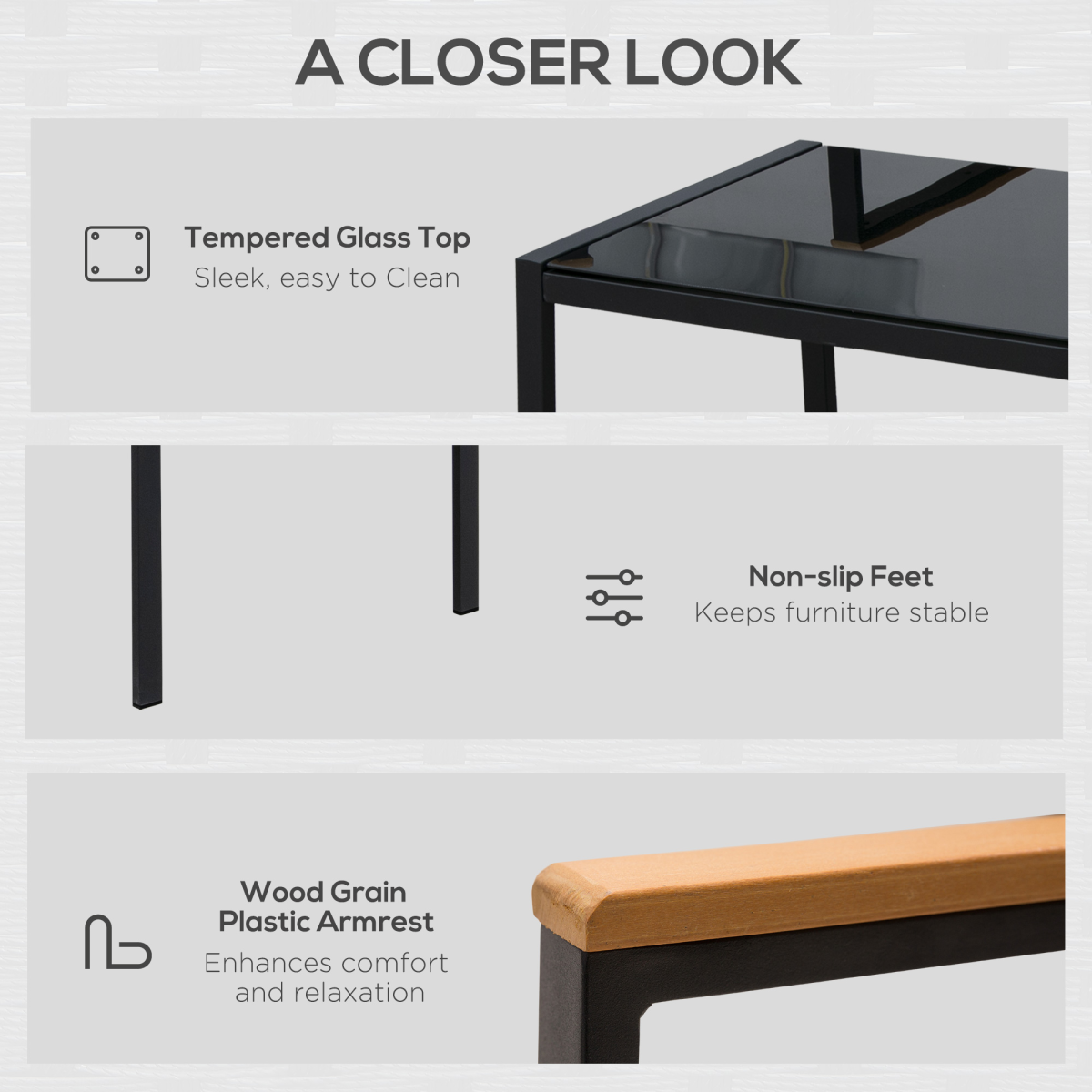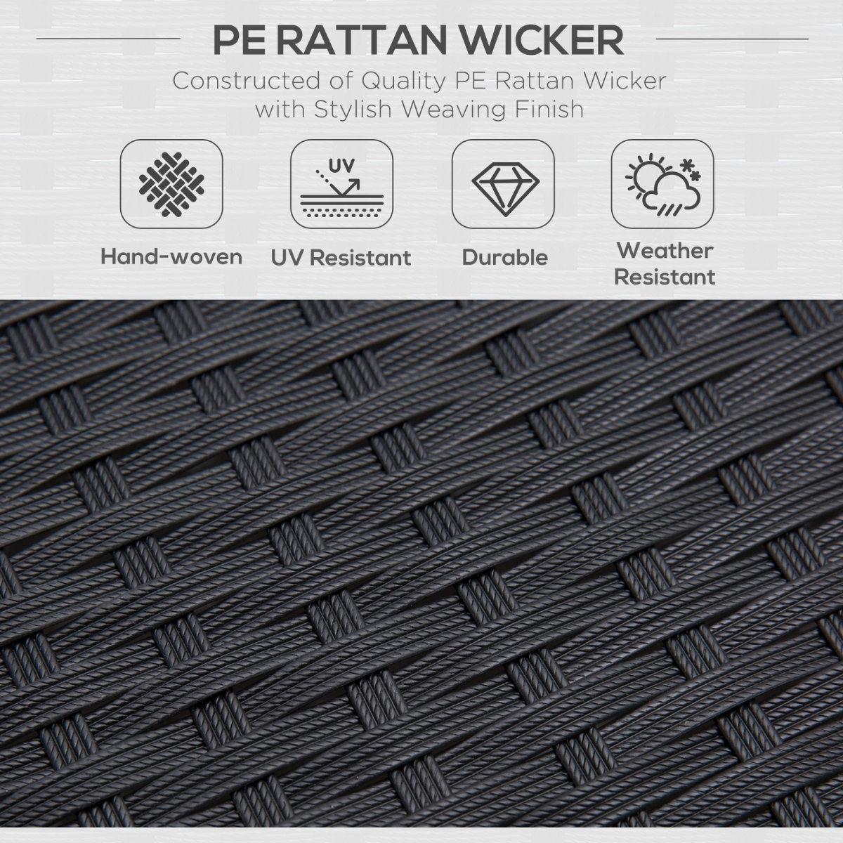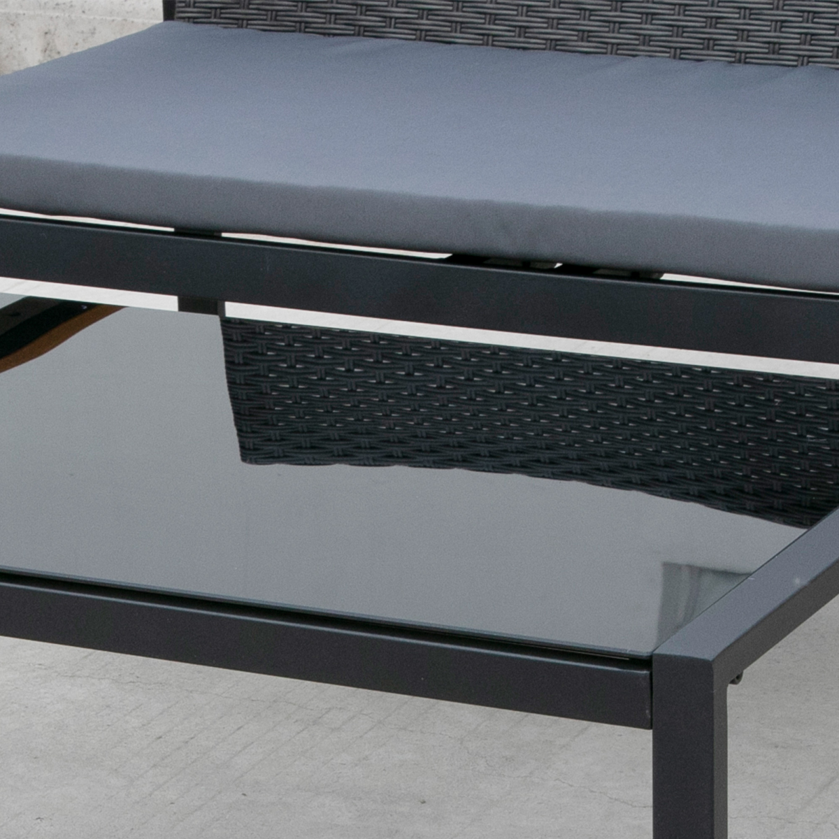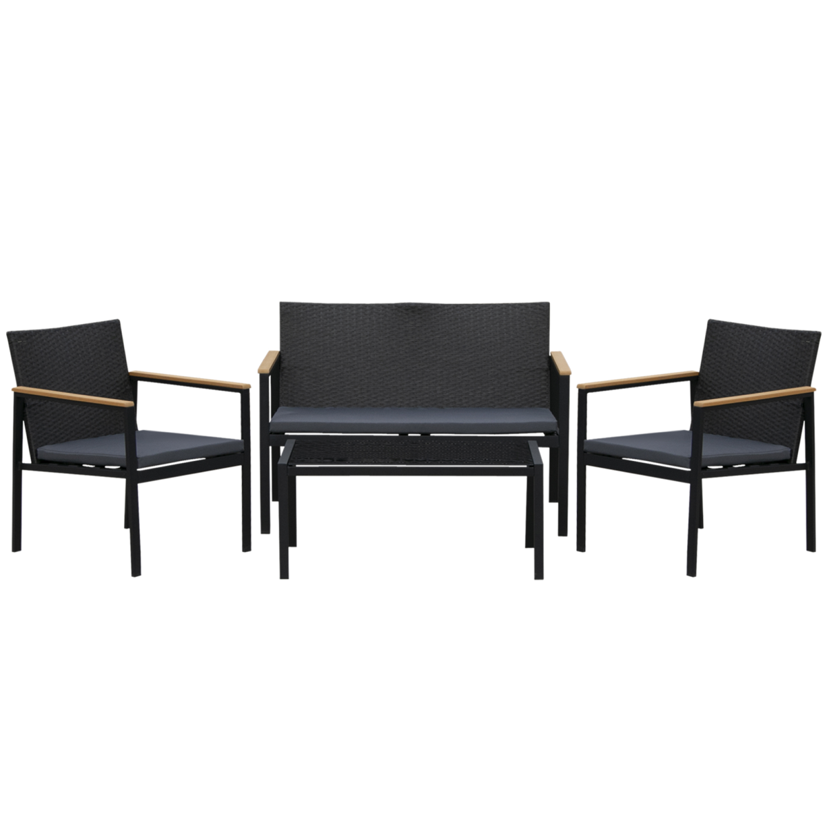 Featuring a sleek matte black metal frame paired with dark grey woven PE rattan, this outdoor dining set brings a sophisticated yet understated charm. The durable metal construction ensures that each piece is sturdy and built to last. The armrests on the chairs and loveseat are crafted from polywood, keeping them pleasantly cool even under the hot summer sun.