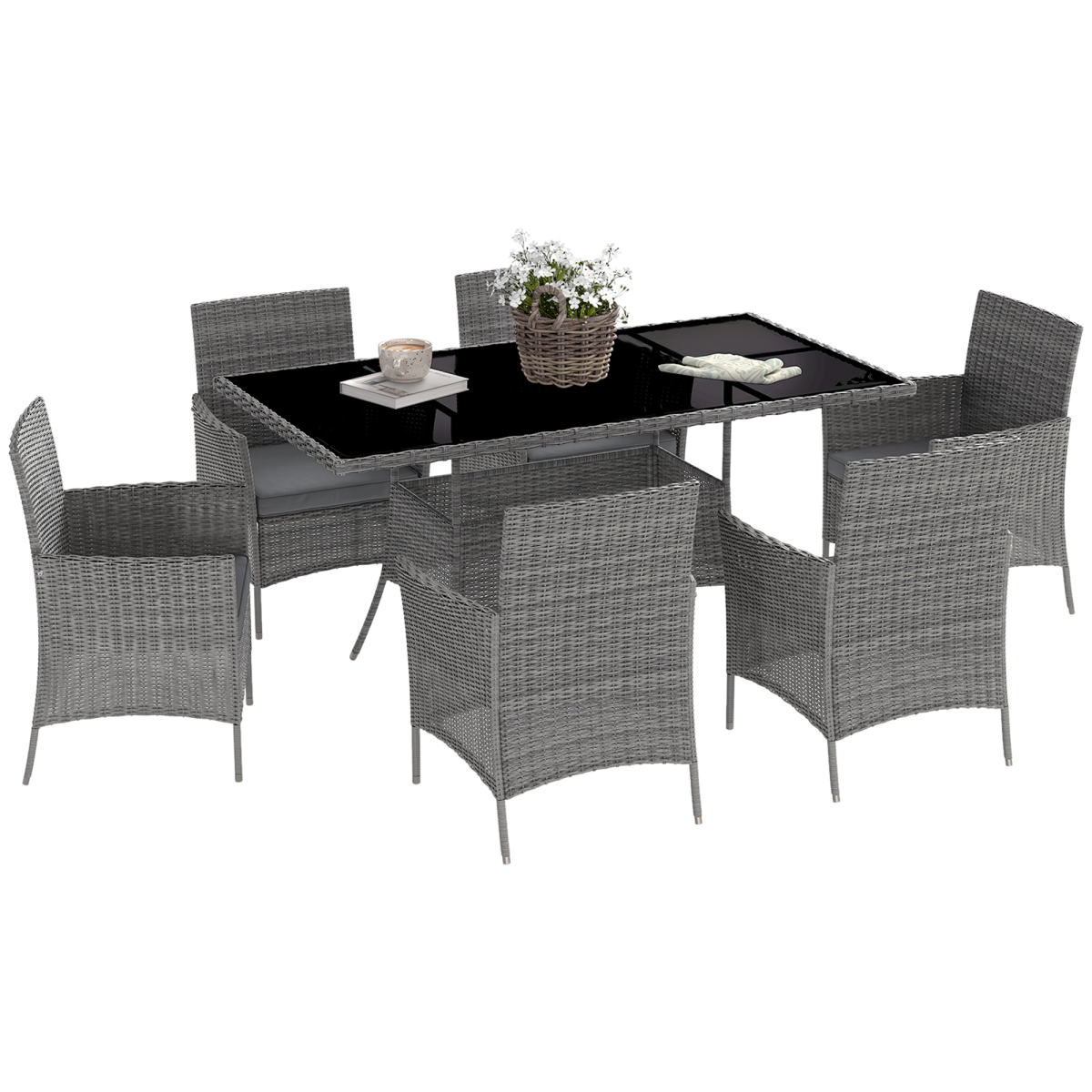 Enhance your outdoor dining experience with the elegant and stylish Rattan Dining Set. This deluxe 7-piece set is designed to comfortably accommodate six people, making it the perfect choice for family gatherings or entertaining friends in your patio or garden. Crafted from high-quality PE rattan and featuring a robust metal frame, this dining set ensures superior sturdiness and longevity, standing up to the elements and giving you years of enjoyment.