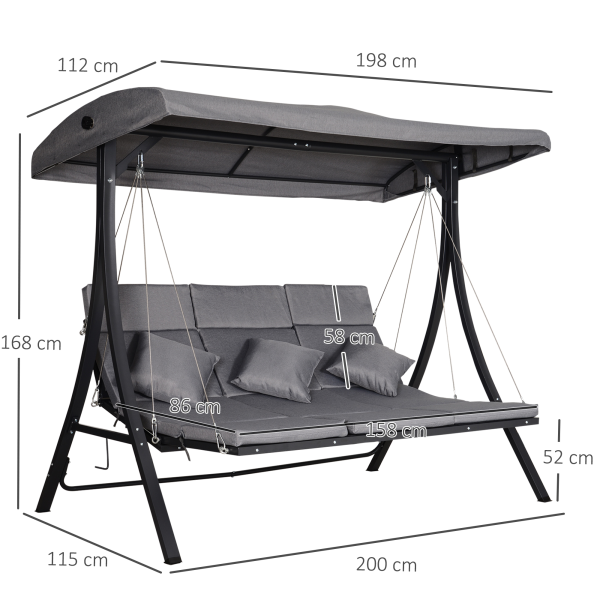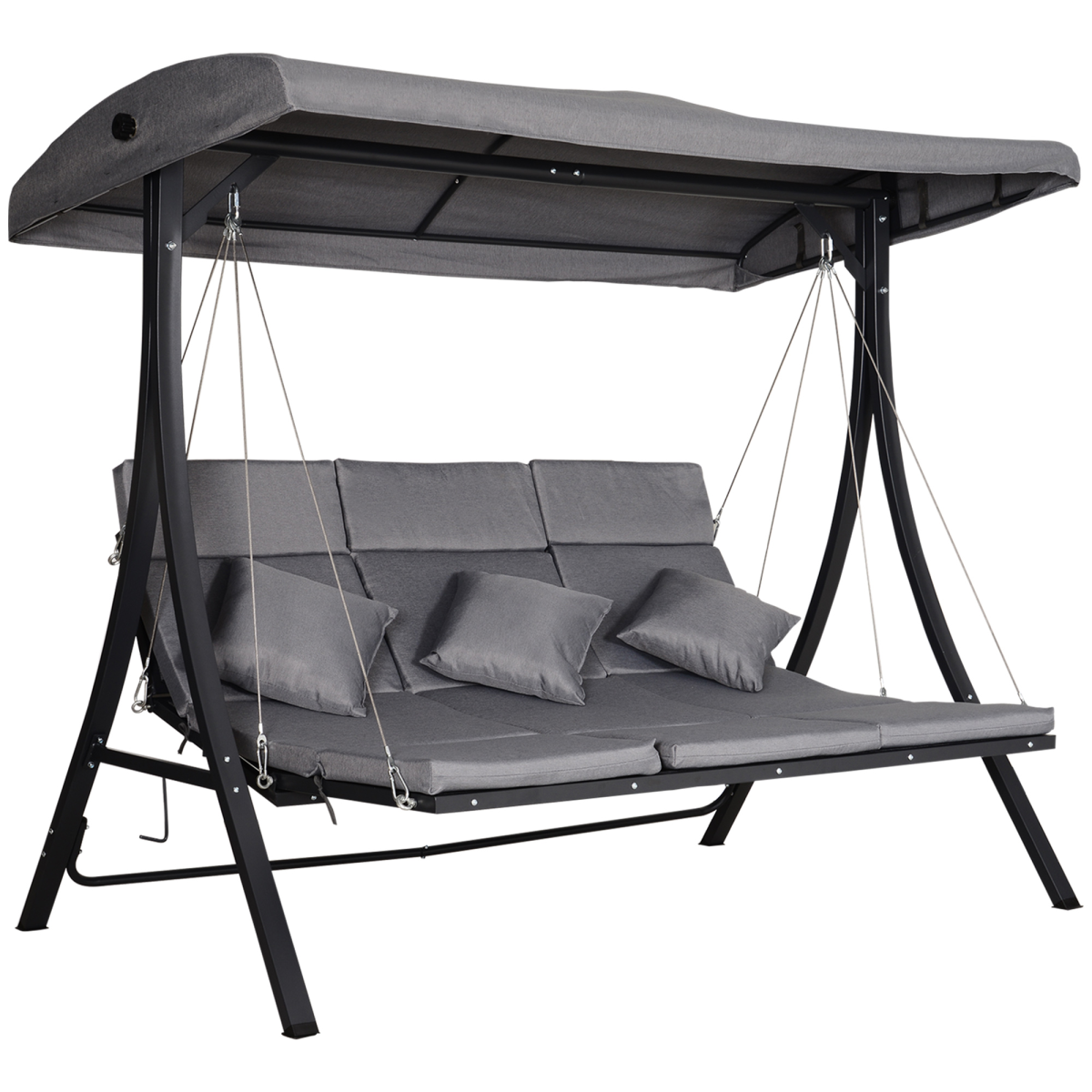 Elevate your outdoor relaxation with the Outsunny Steel Pipe 3-Seater Outdoor Garden Recliner Swing Chair in a sophisticated dark grey hue. Built on a robust A-shaped frame crafted from rust-resistant steel, this swing chair ensures lasting stability and support, capable of holding up to 270kg. The chair swings gracefully from four sturdy metal chains, inviting you to unwind in its smooth, curved design that's tailored for ultimate comfort.