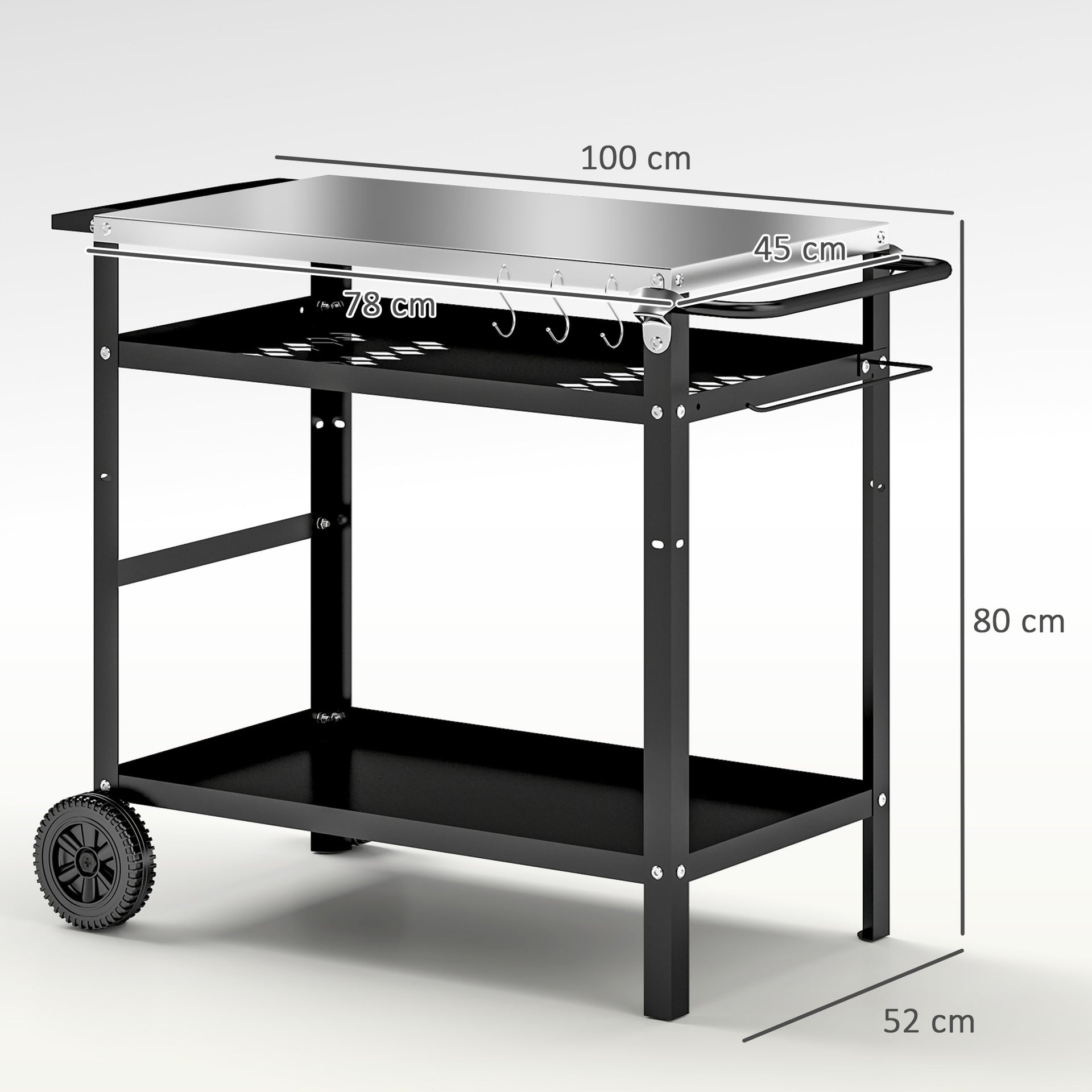 Elevate your outdoor entertaining with the BBQ Trolley, a versatile pizza oven table designed to make hosting a breeze. This all-inclusive BBQ cart features a sleek stainless steel tabletop that not only adds style but also provides a durable surface for meal prep and serving. With spacious shelves, a handy seasoning tray, and multiple functional hooks, you'll have everything you need right at your fingertips. Its large wheels ensure easy mobility, making it the perfect companion for picnics, BBQs, or family gatherings. Get ready to roll with Outsunny and impress your guests!