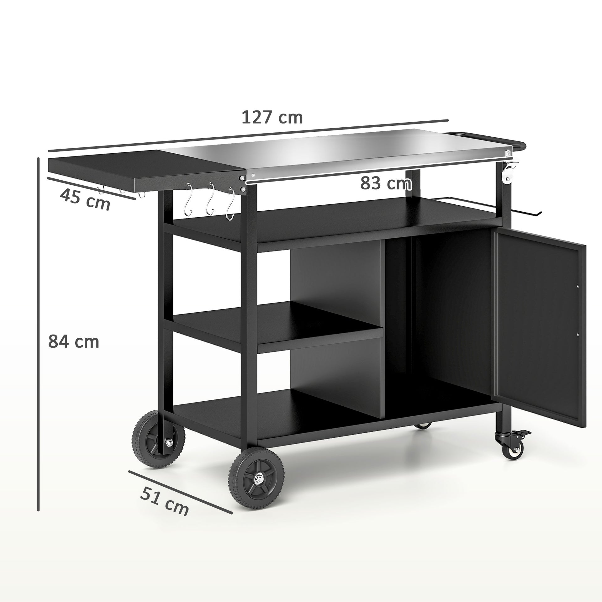 Mobility is a key feature of this outdoor BBQ trolley, as it glides effortlessly on sturdy wheels, allowing you to position it wherever your grilling desires lead you. Whether you're hosting a backyard barbecue or whipping up pizzas for a cozy gathering, this trolley is an indispensable addition to your outdoor setup.