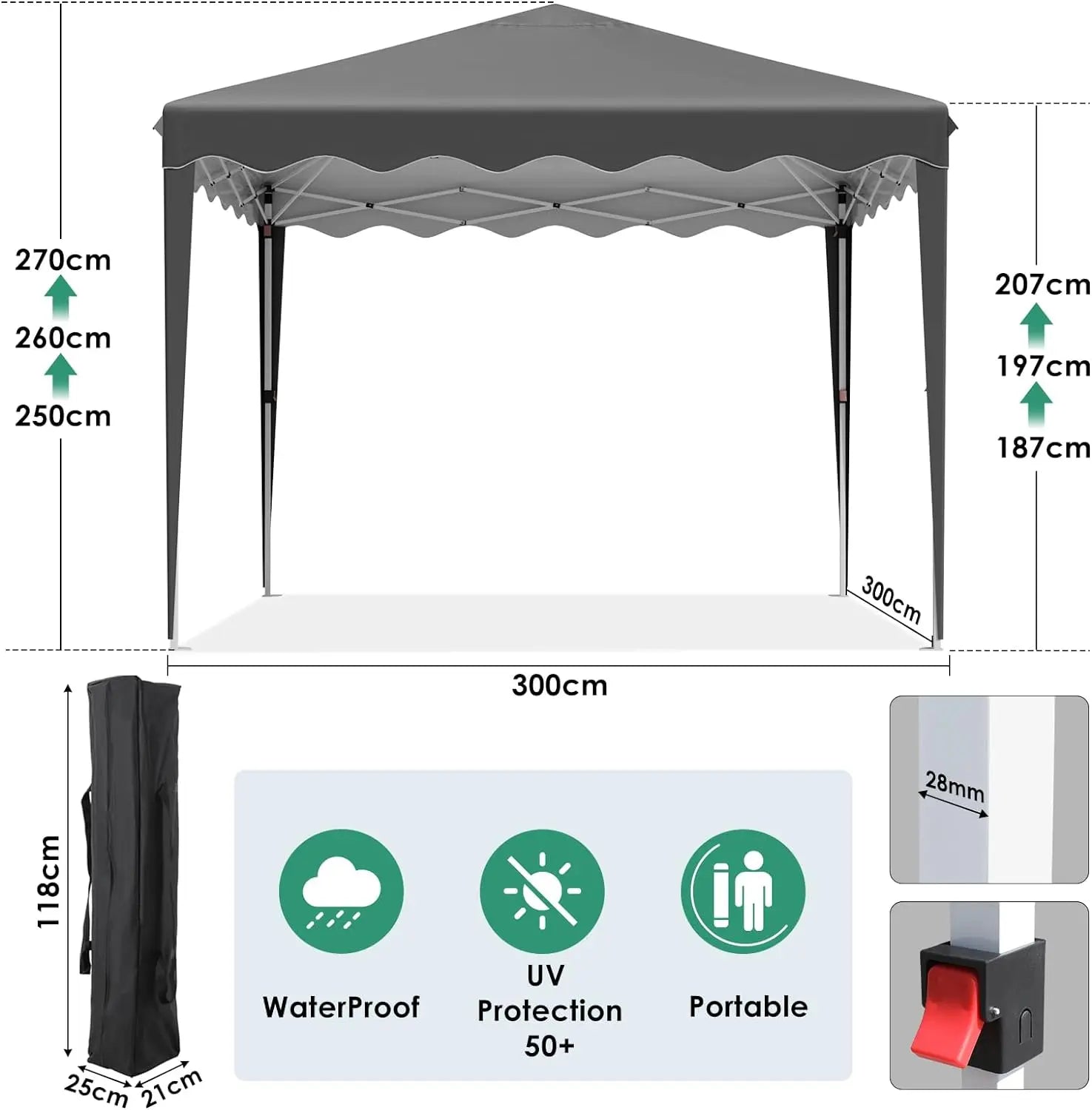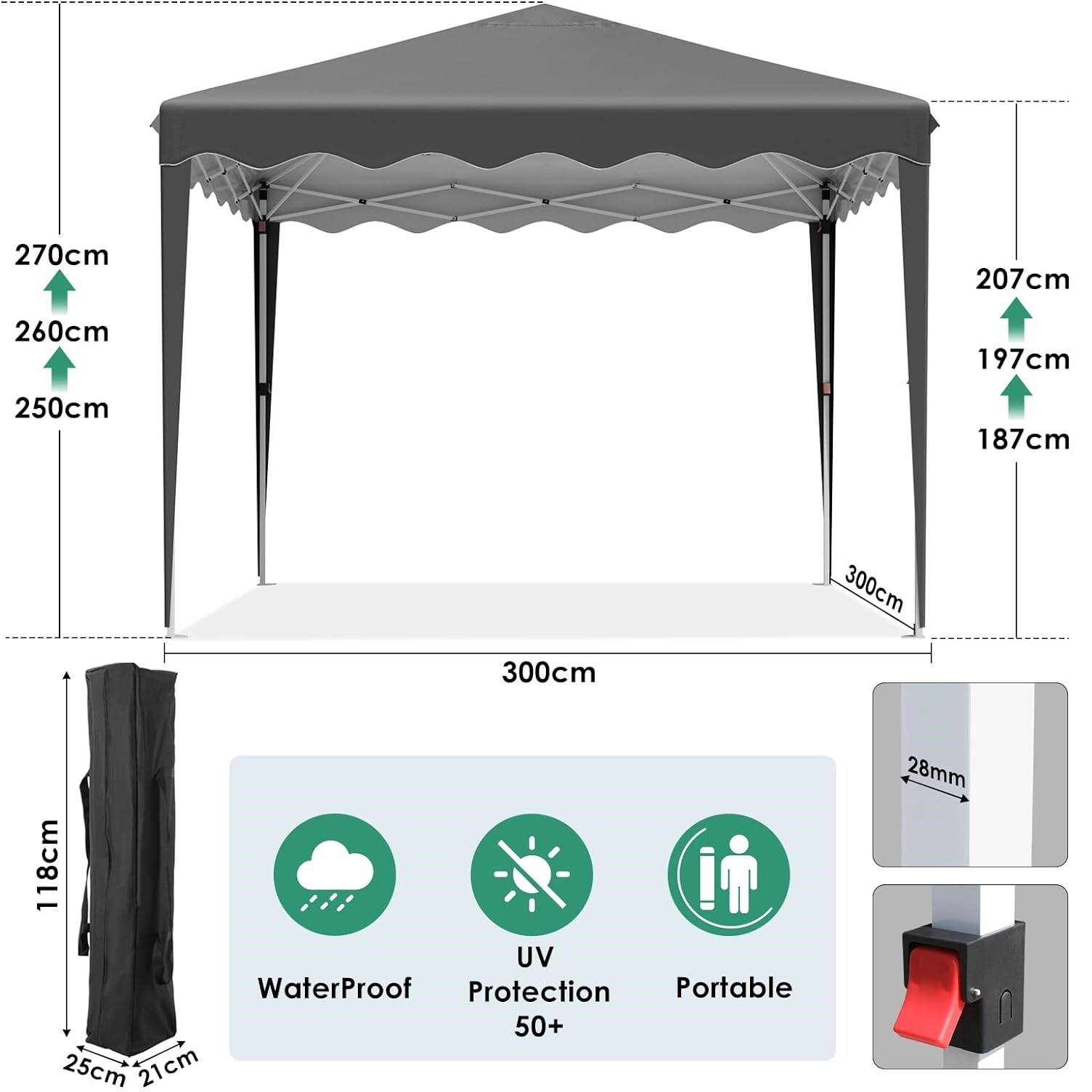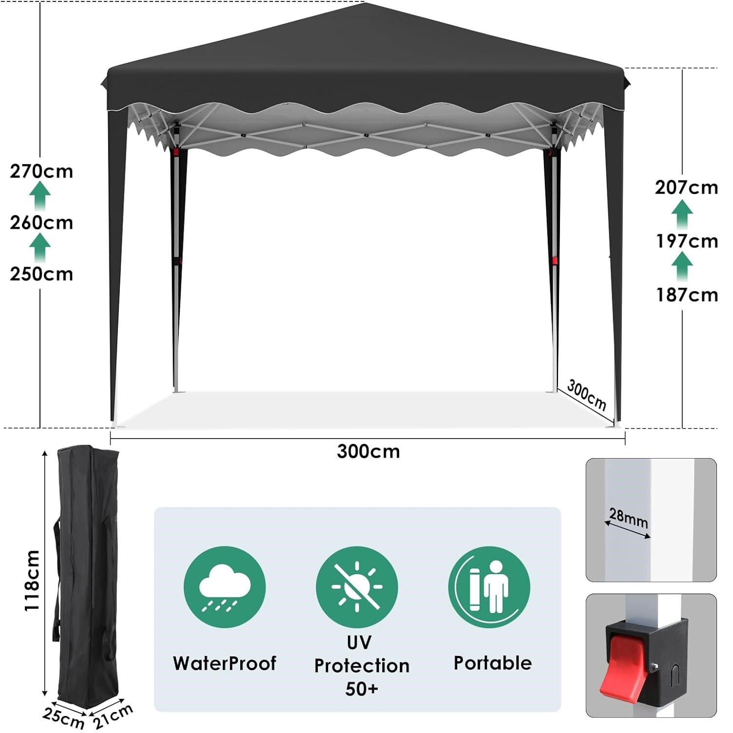 Height adjustment design: folding gazebo 3 x 3 waterproof stable. Each leg has up and down quick release buttons, which can be easily folded and adjusted in height (250 cm, 260 cm and 270 cm). Note: Please be careful when adjusting the height to avoid pinching your fingers. The long-term use of the pop-up gazebo extreme weather conditions (such as Ststorms), it is recommended to fold the garden gazebo and store indoors.
