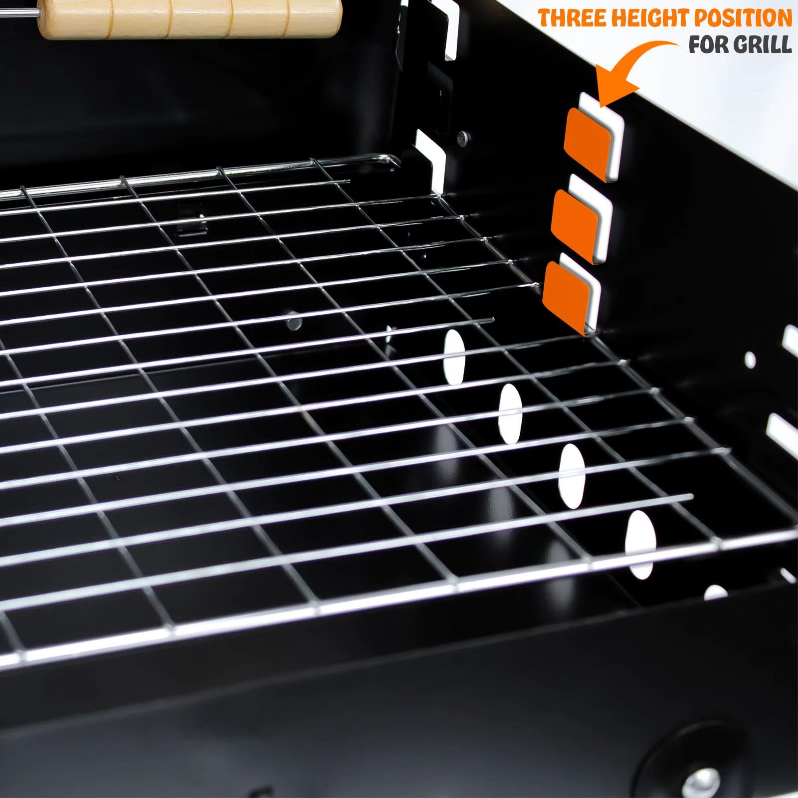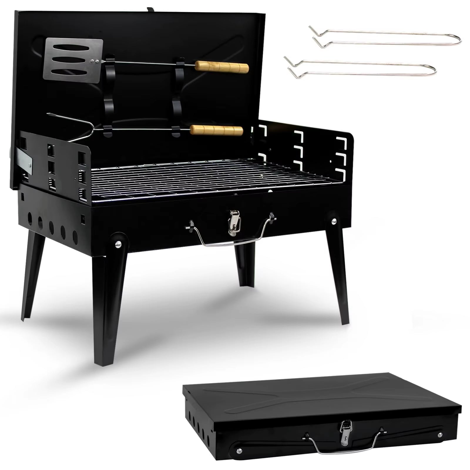 The Portable Folding Charcoal Barbecue Grill offers a smart, space-saving design that folds neatly like a suitcase, making it ideal for transport and storage. Equipped with essential BBQ tools, it ensures convenience whether you're camping, tailgating, or enjoying a backyard cookout. Its compact structure allows for easy assembly and disassembly, while the sturdy carry handle enhances portability. Crafted in sleek black, this grill combines functionality with style, providing an expert-level grilling experience wherever you go. Perfect for those who value efficiency and quality in outdoor cooking gear.