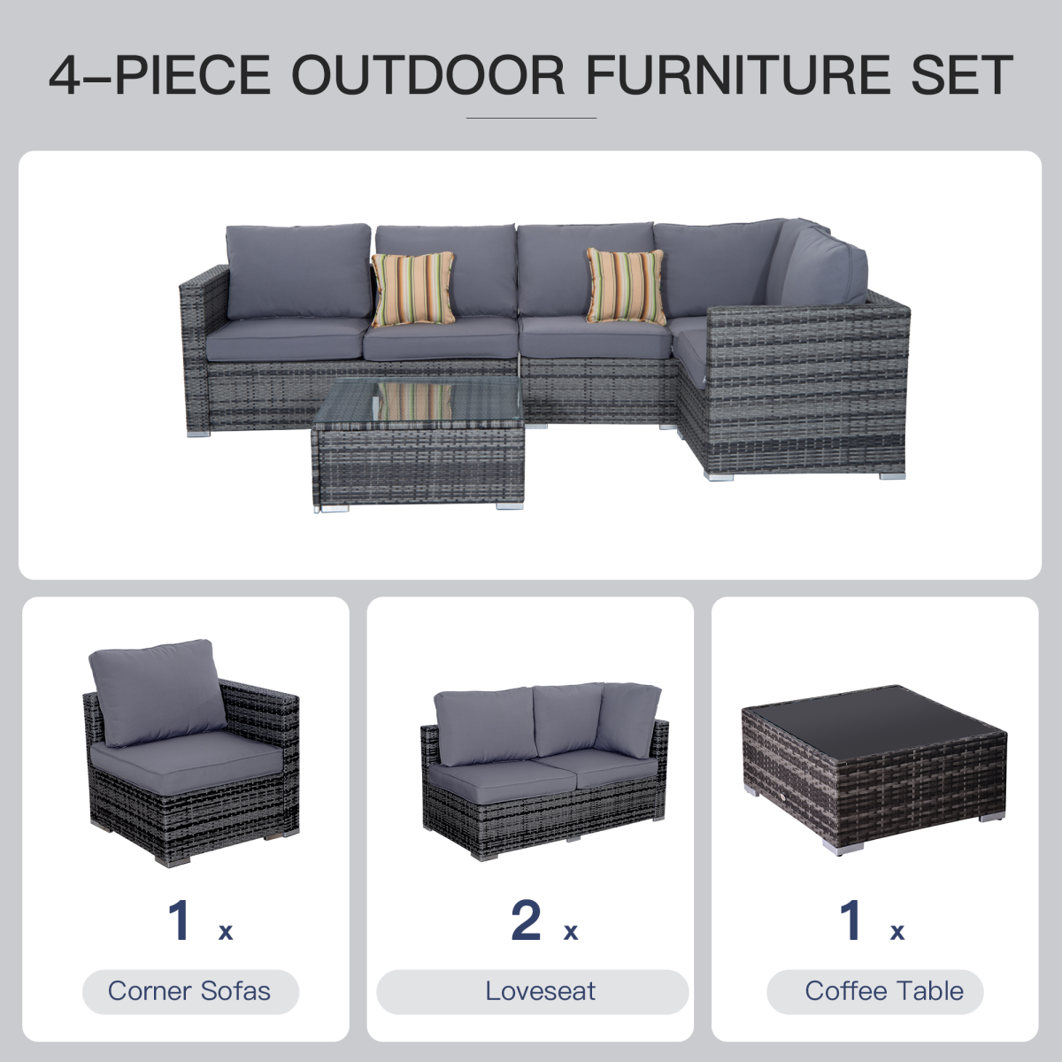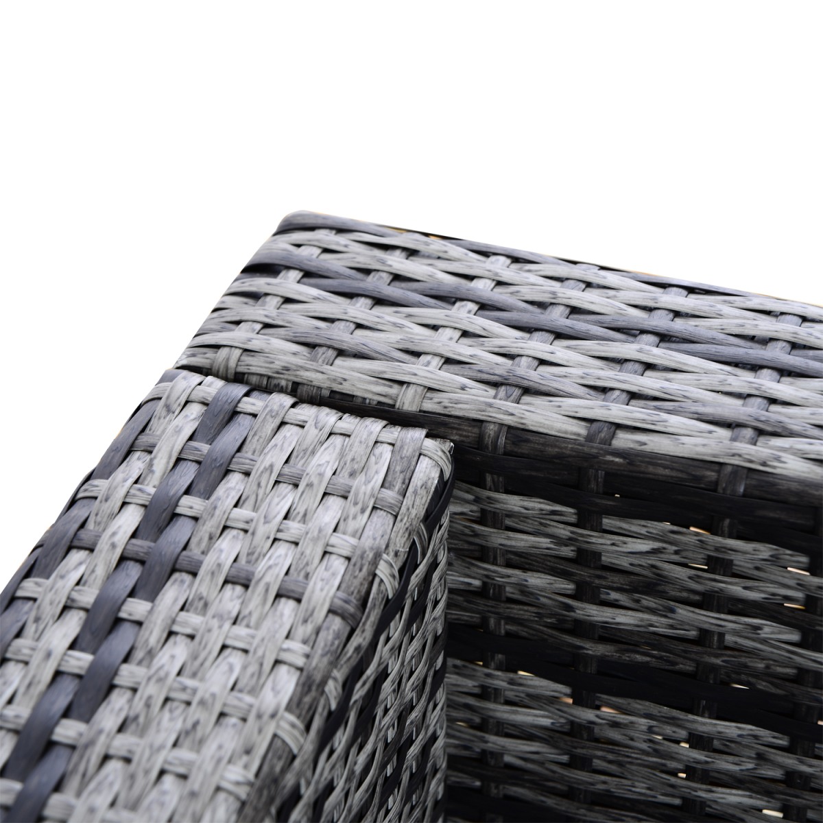 Rattan Set, 4 PC-Grey Description: This corner rattan garden set is a great addition to any garden, patio, or conservatory. This new design is very practical and gives a great elegant feel to your outdoor living. The set comes with cushions for seating and backrest, and the table is topped with glass for placing drinks and food. The set is made from an aluminum frame and covered with PE rattan. The cushion covers can be removed and washed for easy maintenance. This stylish design will compliment your outdoor living and create a great second lounge area. Features: - Includes 1 corner piece, 2 two seaters, 1 coffee table, and 11 cushions - Perfect for outdoor use, such as garden, yard, poolside, patio, deck, and more - Constructed with weather-proof rattan and rust-free aluminum frame - Modern design and sophisticated look suit any outdoor décor style - Rust-free and maintenance-free - Tempered glass top table for easy cleaning - Removable and flame retardant cushion covers - Assembly required