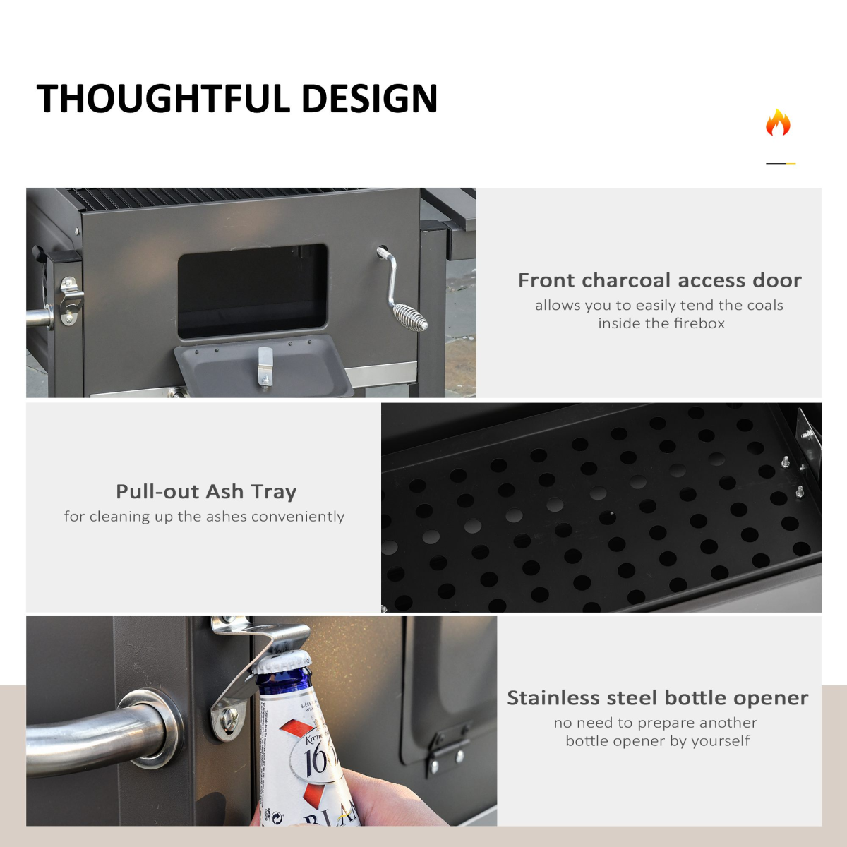 Thoughtful design elements make this charcoal BBQ not only functional but also user-friendly. The grill comes equipped with a handy bottle opener and features stainless steel handles that provide good grip while staying cool to the touch. Cleaning up is simple thanks to the pull-out ash tray that efficiently collects all the ash produced during grilling.