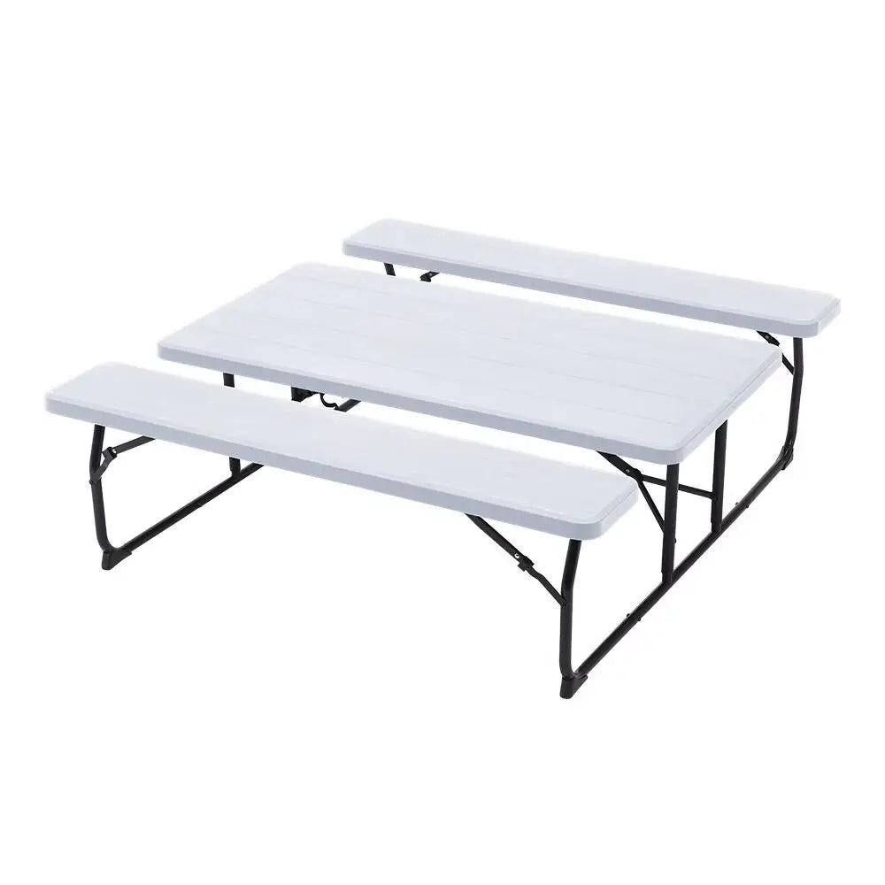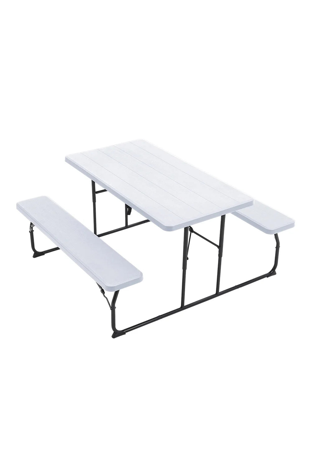 Discover the convenience and versatility of this Livingandhome picnic table and bench set, which features the bonus of natural aesthetics for your outdooradventures. Crafted from robust high-density polyethylene with sturdy steel legs padded with anti-slip protectors, and designed with secure rounded corners, this set ensures a stable and safe sitting experience. Versatile enough to be used on a variety of outdoor occasions, the adjustable tabletop caters to your specific needs. Plus, the foldable design maximizes space efficiency, allowing for convenient storage when not in use.