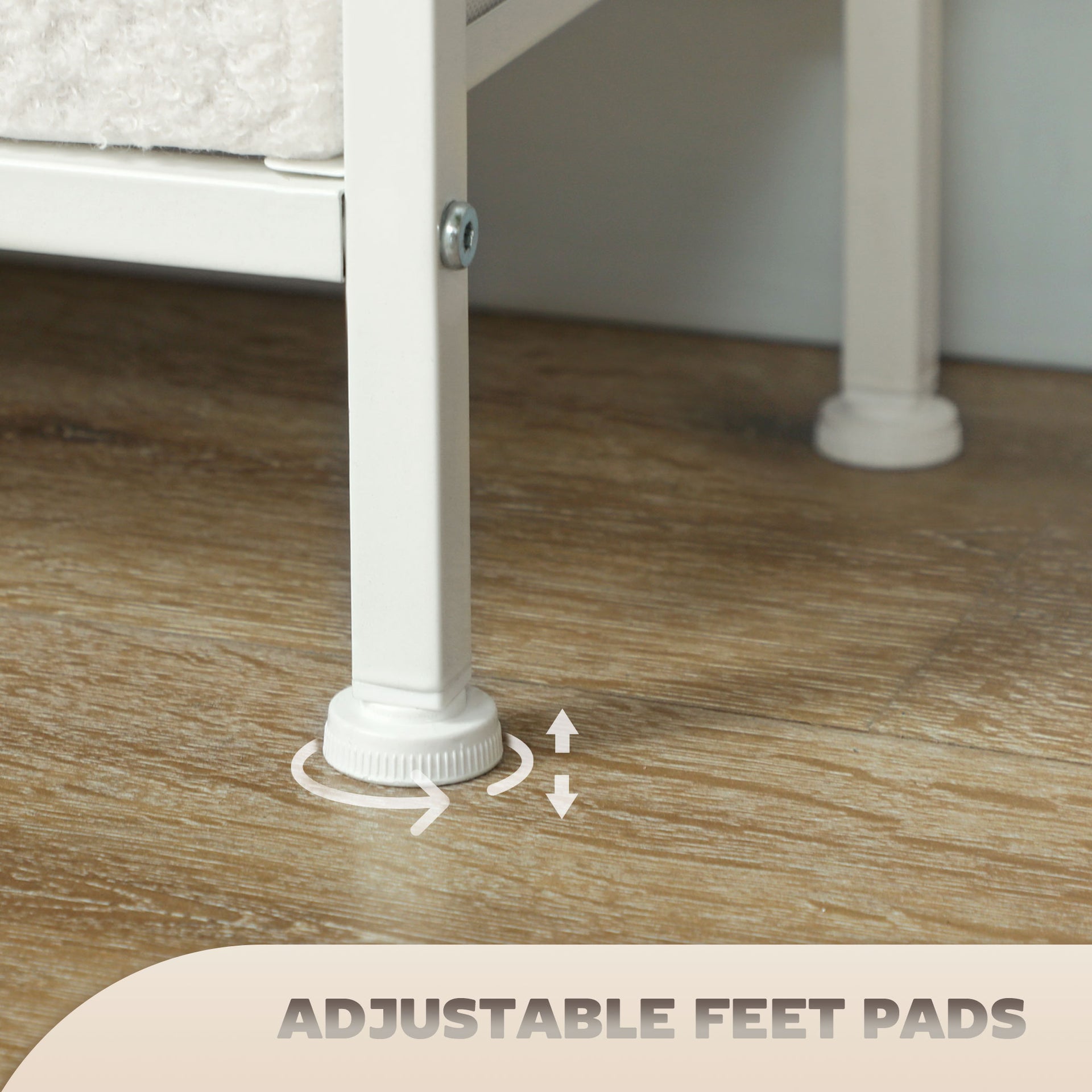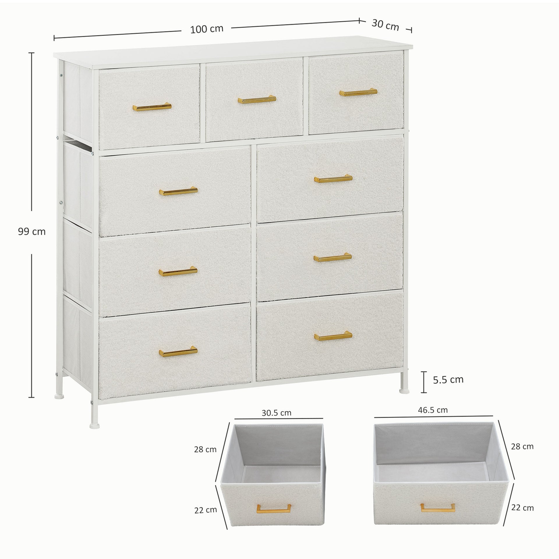 Transform your space with the elegant Fabric Chest of Drawers, a chic storage solution that effortlessly complements any decor style. This stunning unit boasts nine boucle fabric drawers adorned with exquisite gold-tone handles, providing an ample amount of storage while adding a touch of sophistication to your room. The adjustable feet pads ensure optimal stability on any surface, making this versatile piece a perfect choice for your bedroom, hallway, or living area.