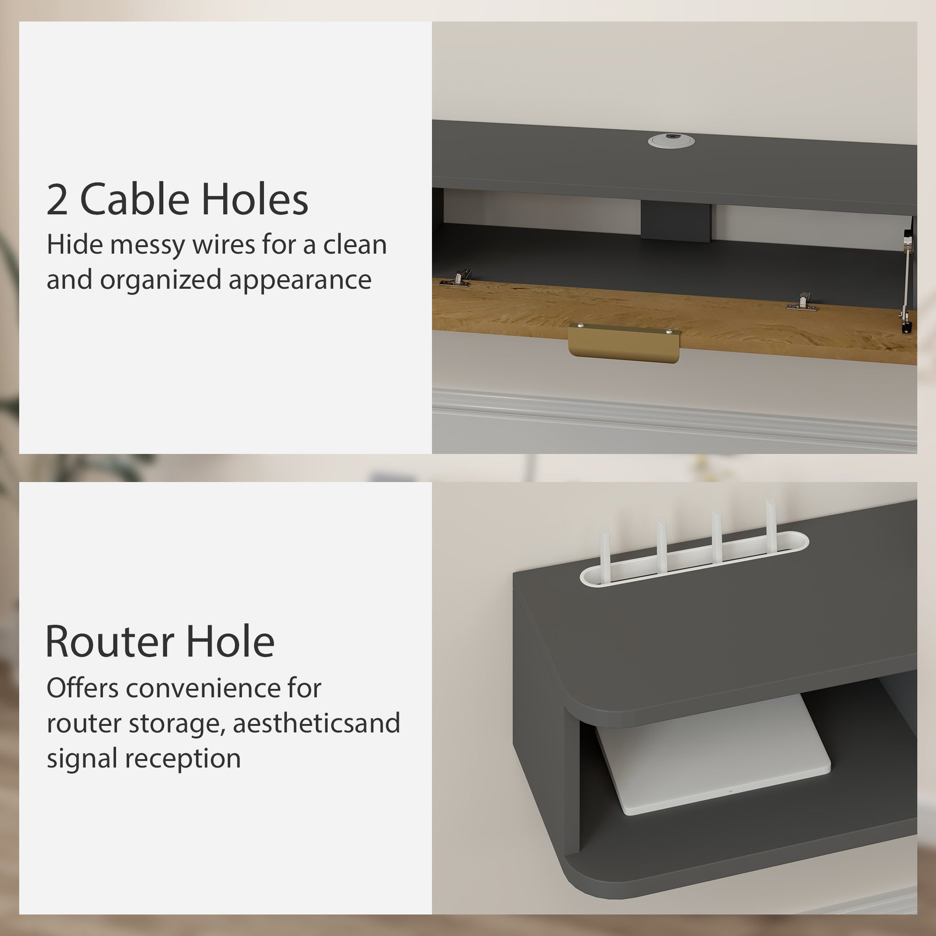 Transform your living area with the sleek and modern Floating TV Cabinet. This stylish wall-mounted unit not only optimizes vertical space but also provides ample storage with two open compartments and a convenient flip-up door cabinet. Keep your entertainment area tidy and sophisticated by effectively managing unsightly cables, thanks to the built-in wire management holes. With its elegant blend of grey and natural wood finishes, this TV console adds a contemporary touch to any room.
