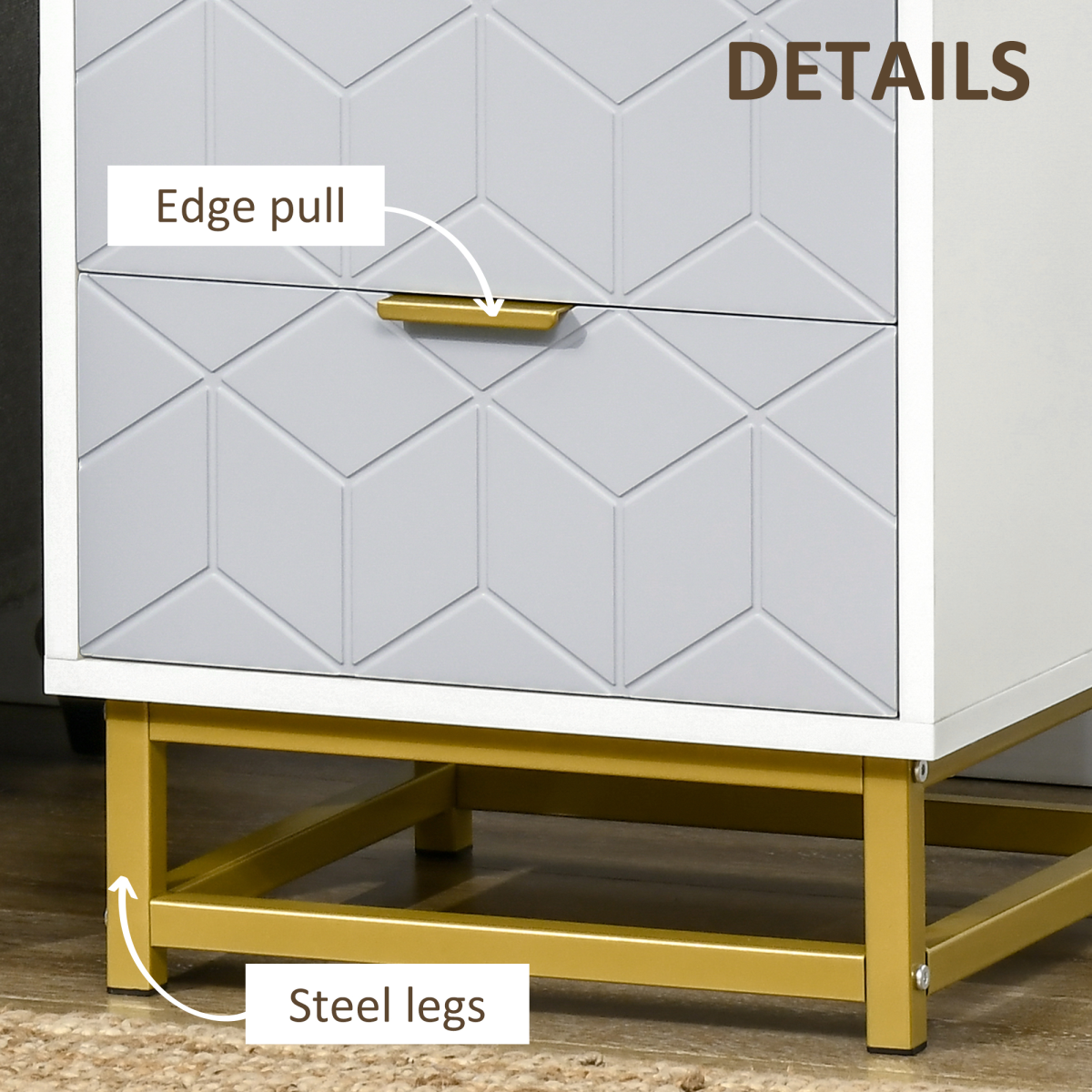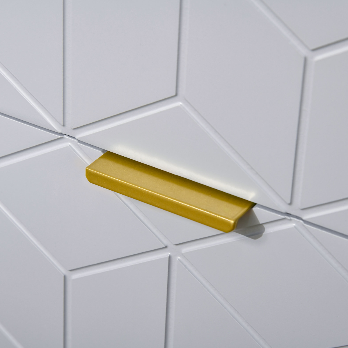 Elevate your home decor with our exquisite Bedside Table featuring a captivating Art Deco design. The cubic embossing on the drawers beautifully complements the gold-tone accents against a pristine white frame, making this nightstand a sophisticated addition to any space.