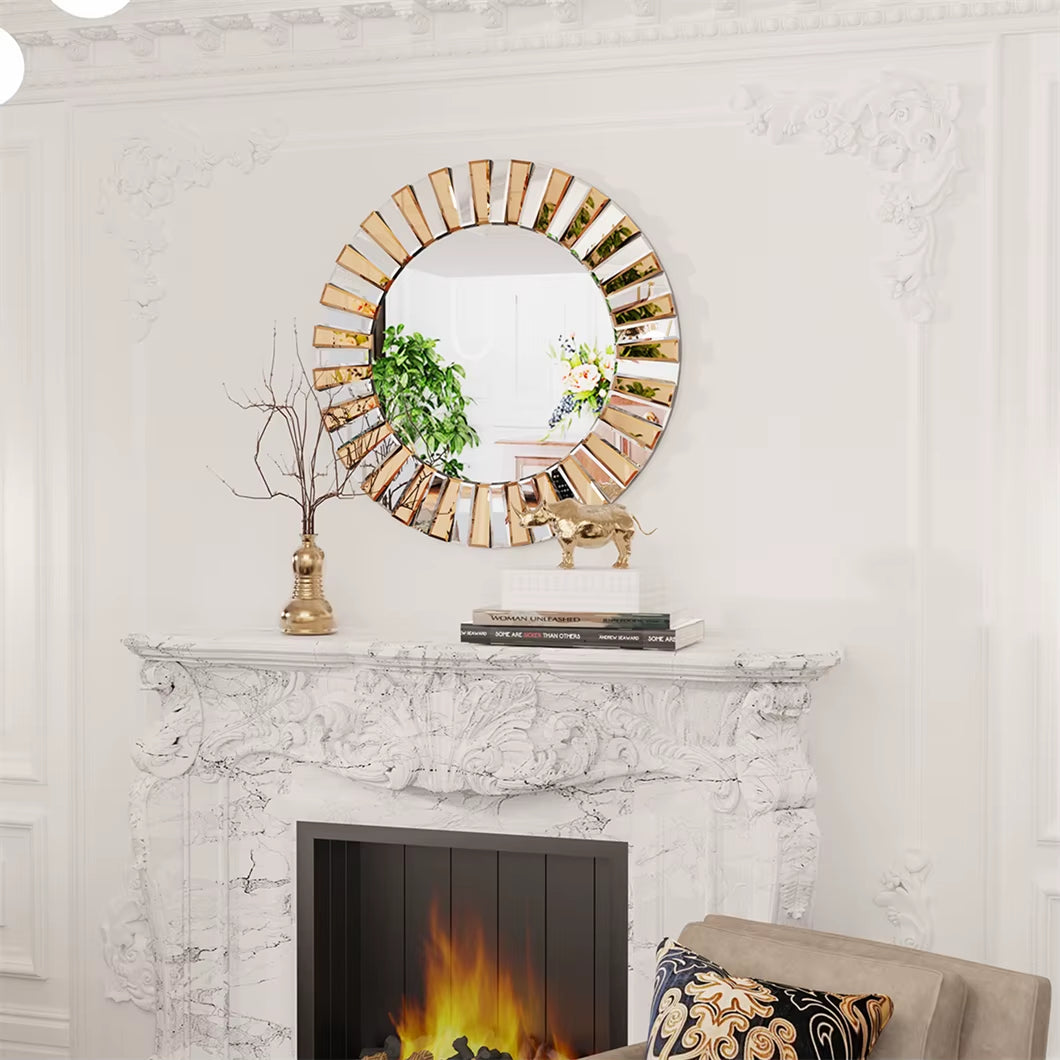 【Unique Sunburst Mirror】Featuring a captivating sunburst design, this mirror is adorned with hand-pieced silver and tawny beveled glass that transforms it into an intriguing art piece. This timeless decor staple is perfect for adding character and charm to your home, seamlessly complementing various home decor styles.