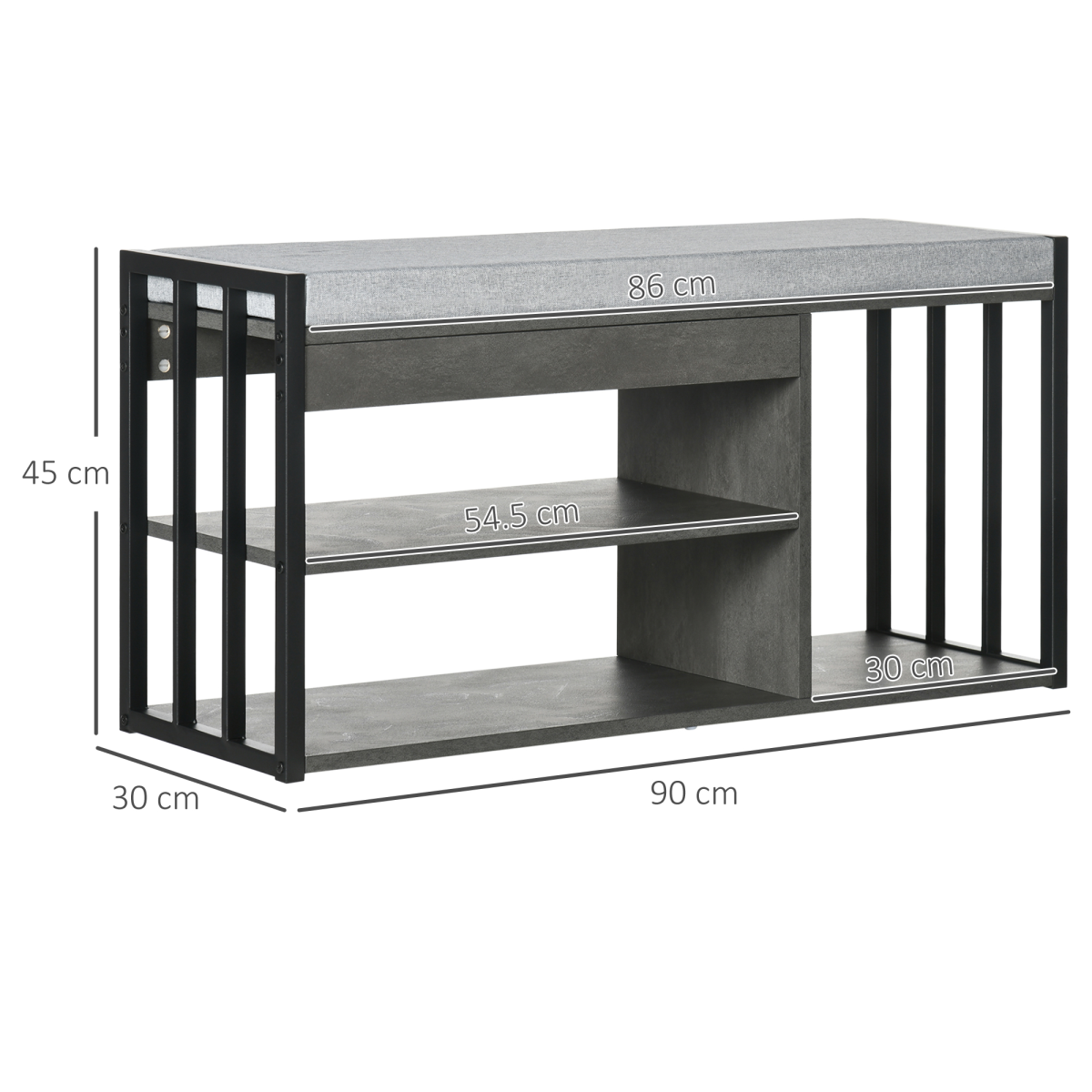 Grey Upholstered Shoe Bench with Open Shelves & Padded Seat