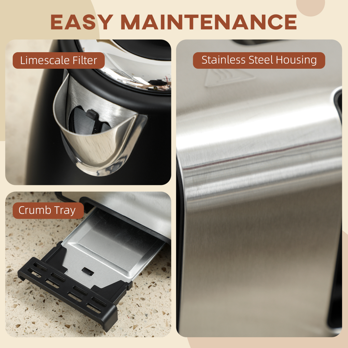 Kickstart your mornings with the HOMCOM Toaster and Kettle Set, an ideal solution for busy families and home offices alike. This formidable duo combines a high-performance 1.7L kettle, equipped with a UK Strix thermostat, ensuring rapid and precise boiling every time. Enjoy peace of mind with safety features including auto shut-off, boil-dry protection, and overheat protection. Complement your beverage with perfectly toasted bread using the four-slot toaster that boasts independent controls and seven customizable shade settings, catering to all your toasting needs from frozen bread to fresh slices. Transform your breakfast routine with this stylish and coordinated kettle and toaster set.