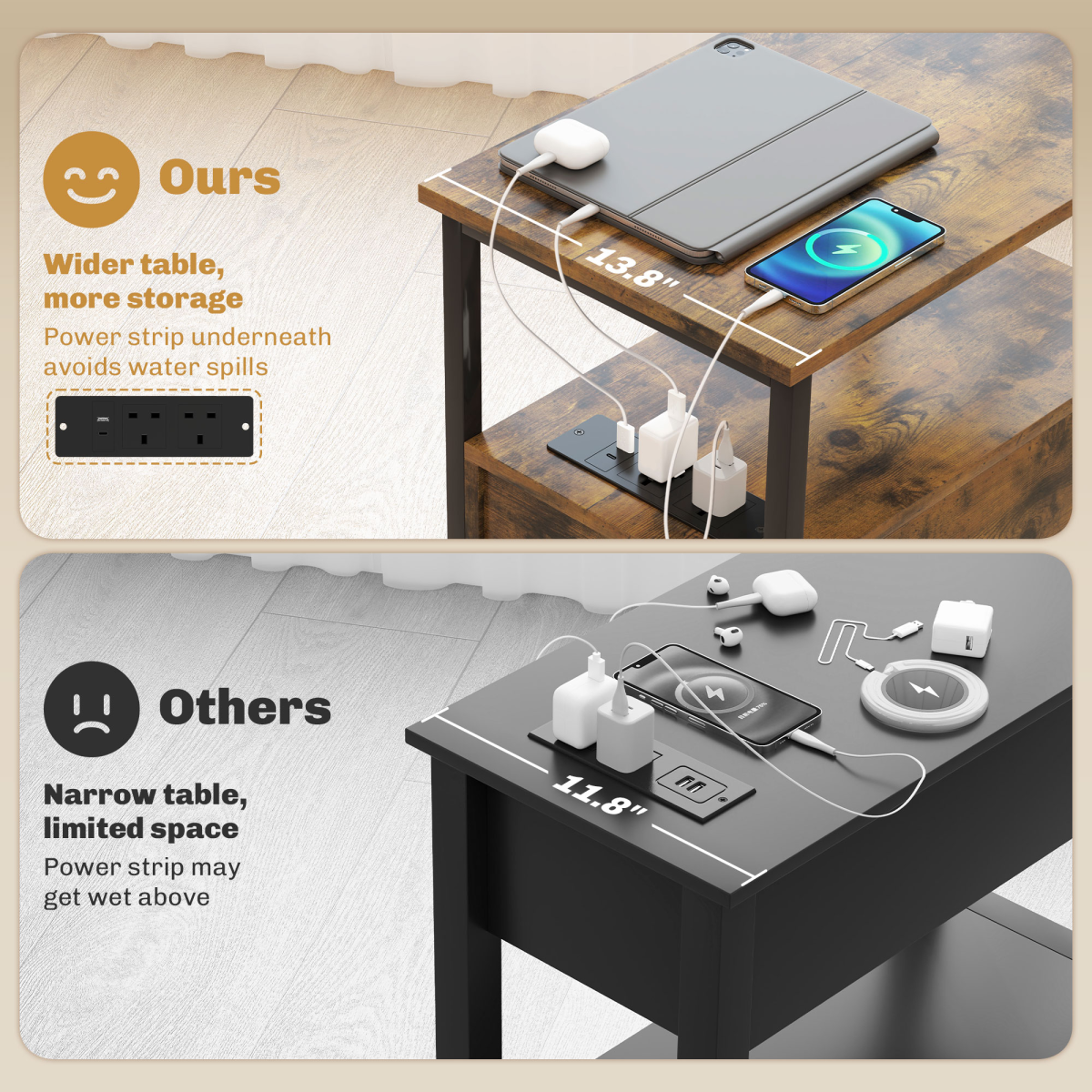 Bedside Table with Charging Station for Living Room, Rustic Brown
