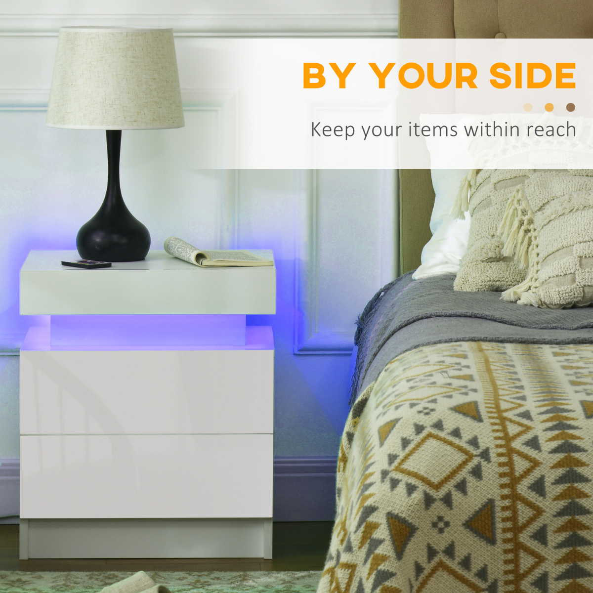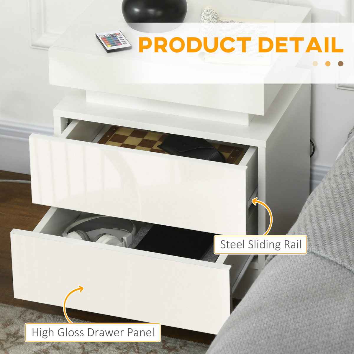 White Bedside Table, High Gloss Front Nightstand w/ LED Light, 2 Drawers