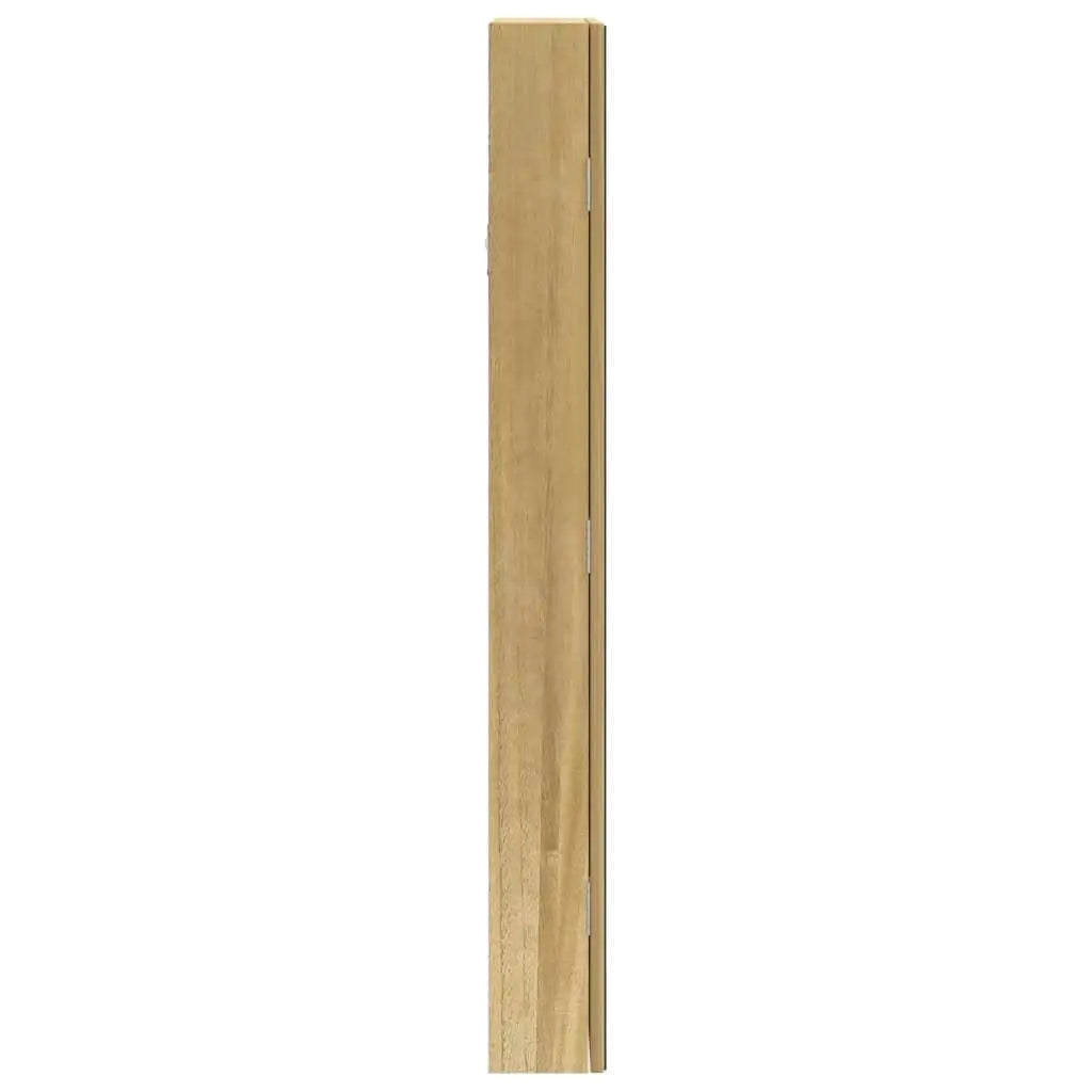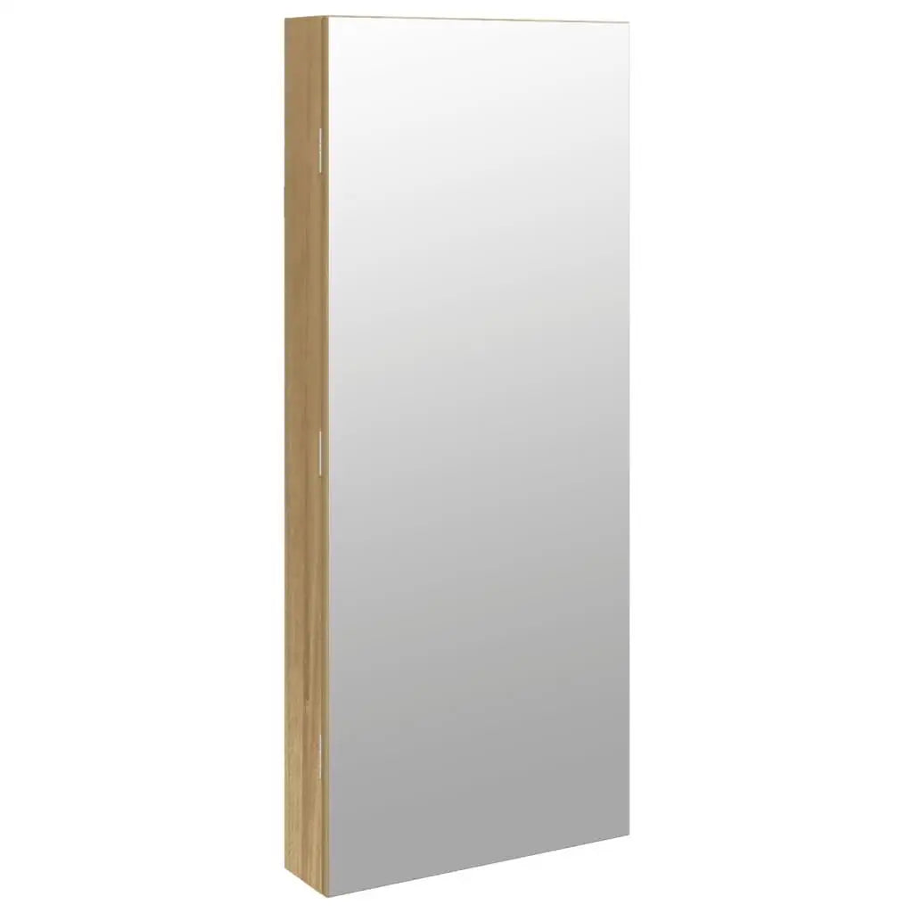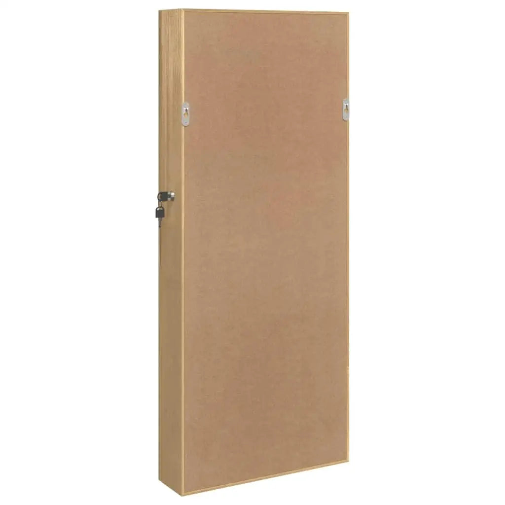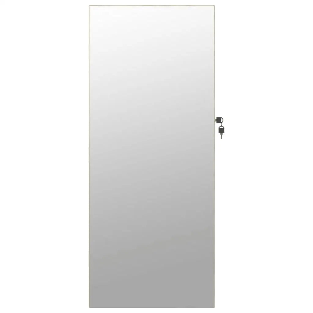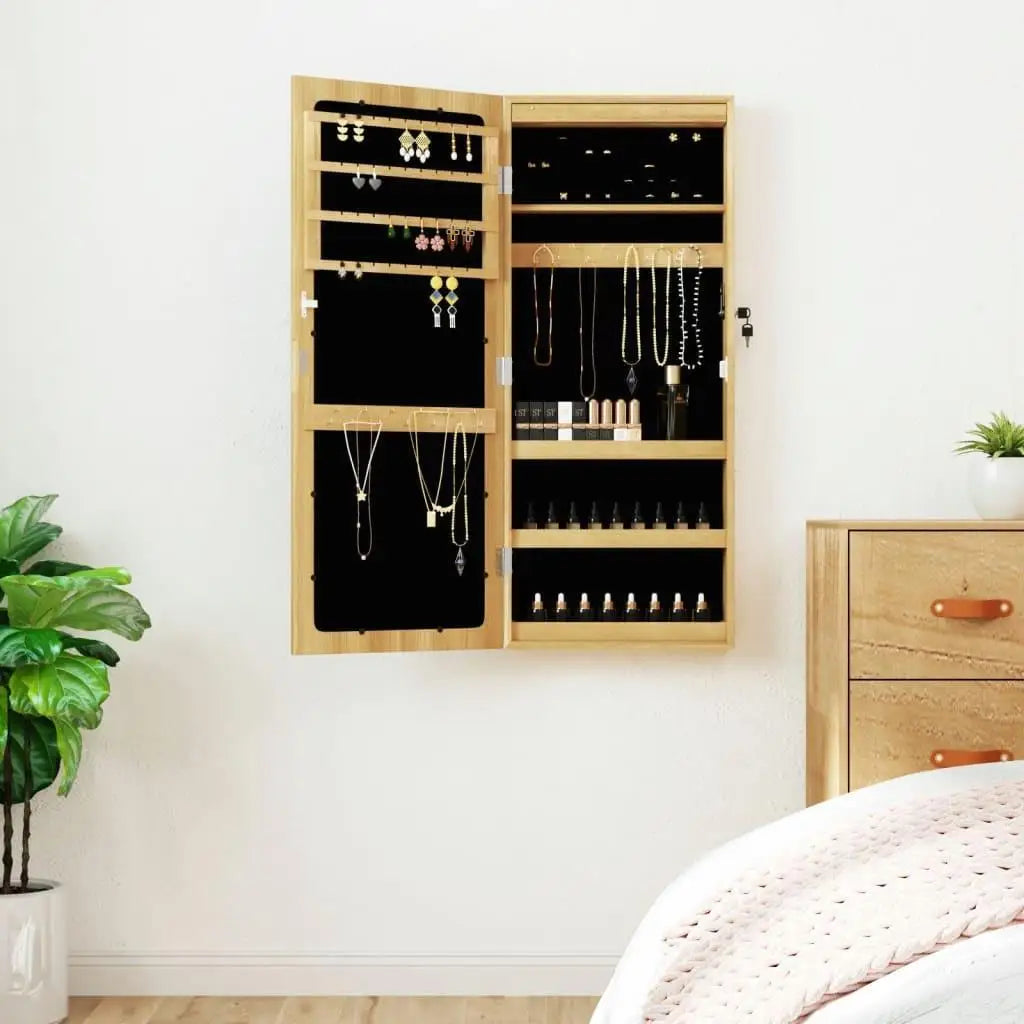 Keep your jewellery and perfumes discreetly and elegantly stored away with this stylish mirror jewellery cabinet with LED lights! Durable material: The engineered wood is of exceptional quality with smooth surface and also features strength, stability and resistance to moisture. Made of engineered wood, the jewellery cabinet is easy to clean with a damp cloth.Ample storage space: The storage mirror offers plenty of hooks, hangers and shelves to keep your jewellery neatly organised and within reach.Practical mirror: With a practical mirror, this jewellery organiser is great for getting ready and applying make-up.Considerate protection: The jewellery storage has a lockable door and comes with 2 keys to ensure the of your items. Also, the soft fabric cover inside not only adds elegance but also protects your beloved jewellery from scratches.Convenient LED lights: Located at the top inside, the LED lights automatically turn on when the door opens to help you find your jewellery.Space-saving design: Hang the mirror jewellery box over the door with the included hooks or mount it on the wall to save floor space. Good to know:Screws for wall mounting are included.3 AA batteries are required but not included in the delivery.