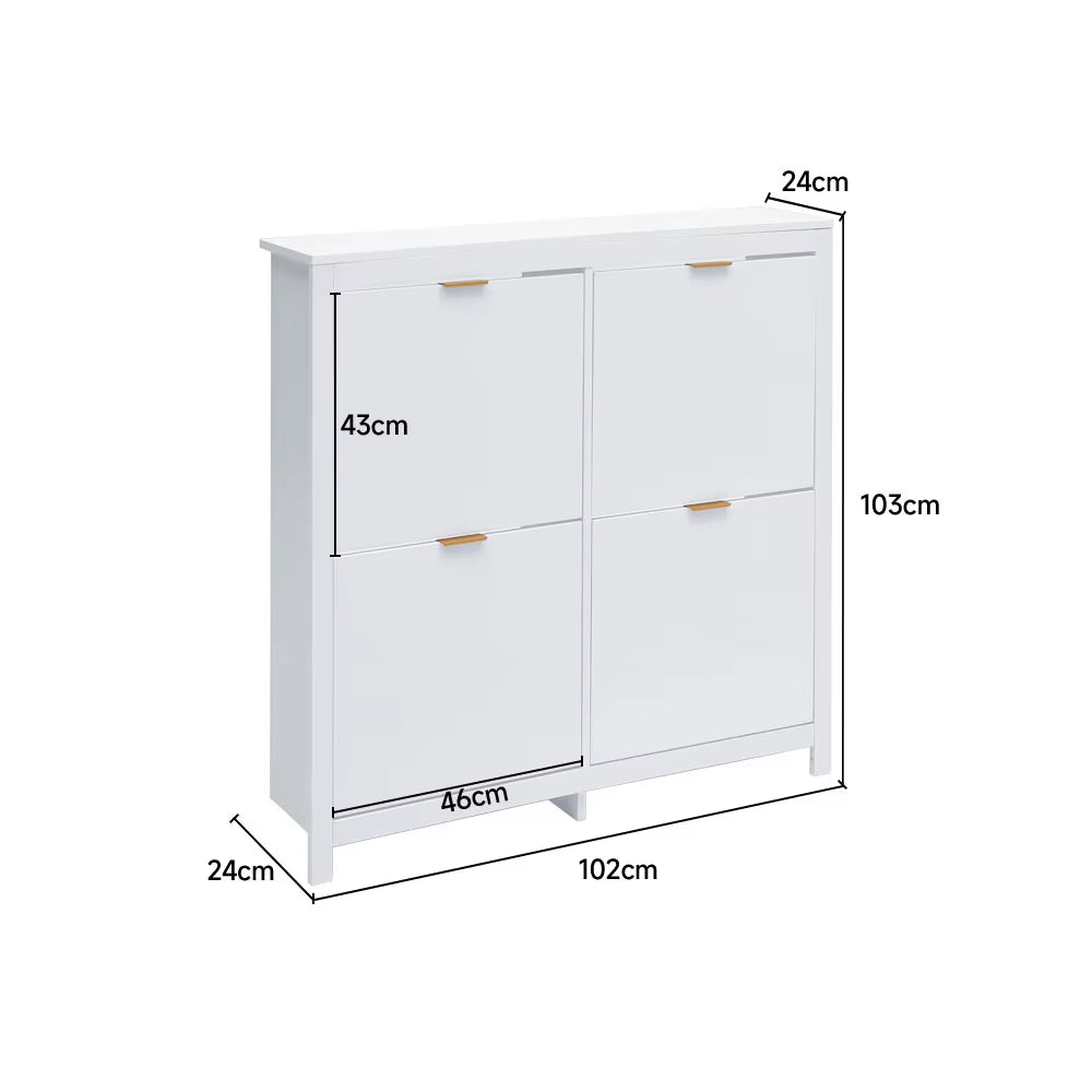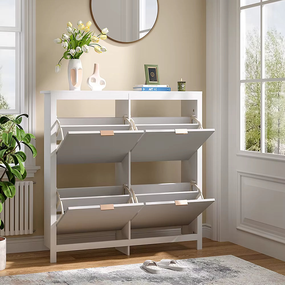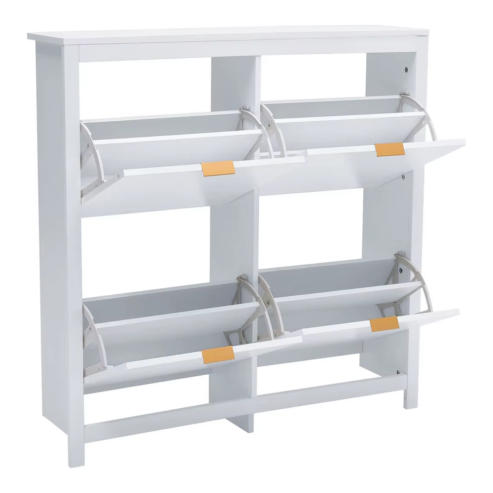 Stash your shoes stylishly in the Livingandhome shoe cabinet. This modern shoe storage solution is designed with a low profile and a svelte size so as to fit neatly against a wall in a hallway, mudroom or entryway. Four compartments each fit four pairs of shoes, this shoe cabinet comfortably holds a total of approximately sixteen pairs of footwear, which varies depending upon the size of your shoes. Better still, the flip-down drawers provide quick and easy access to your shoes when rushing out the door.