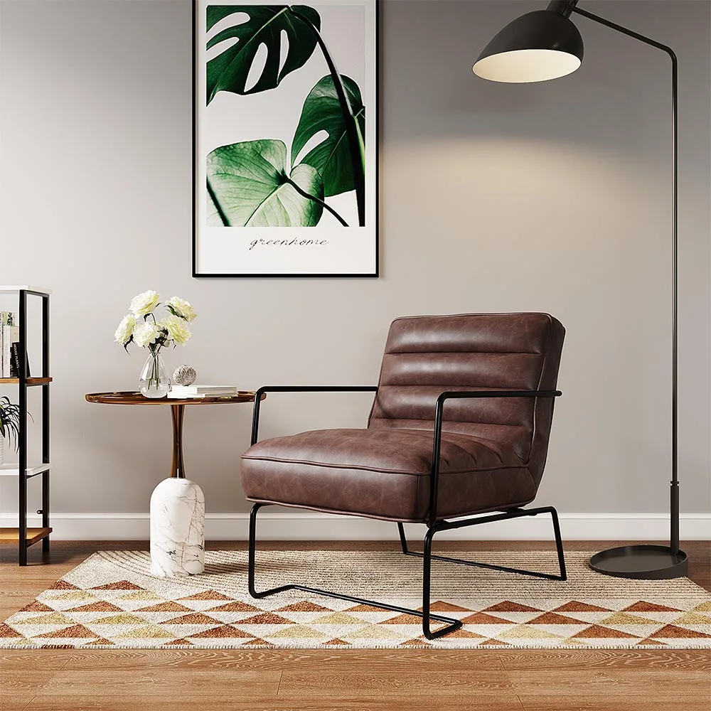 Mid-Century Living Room Chairs PU Leather Linen Armchair with Metal Base