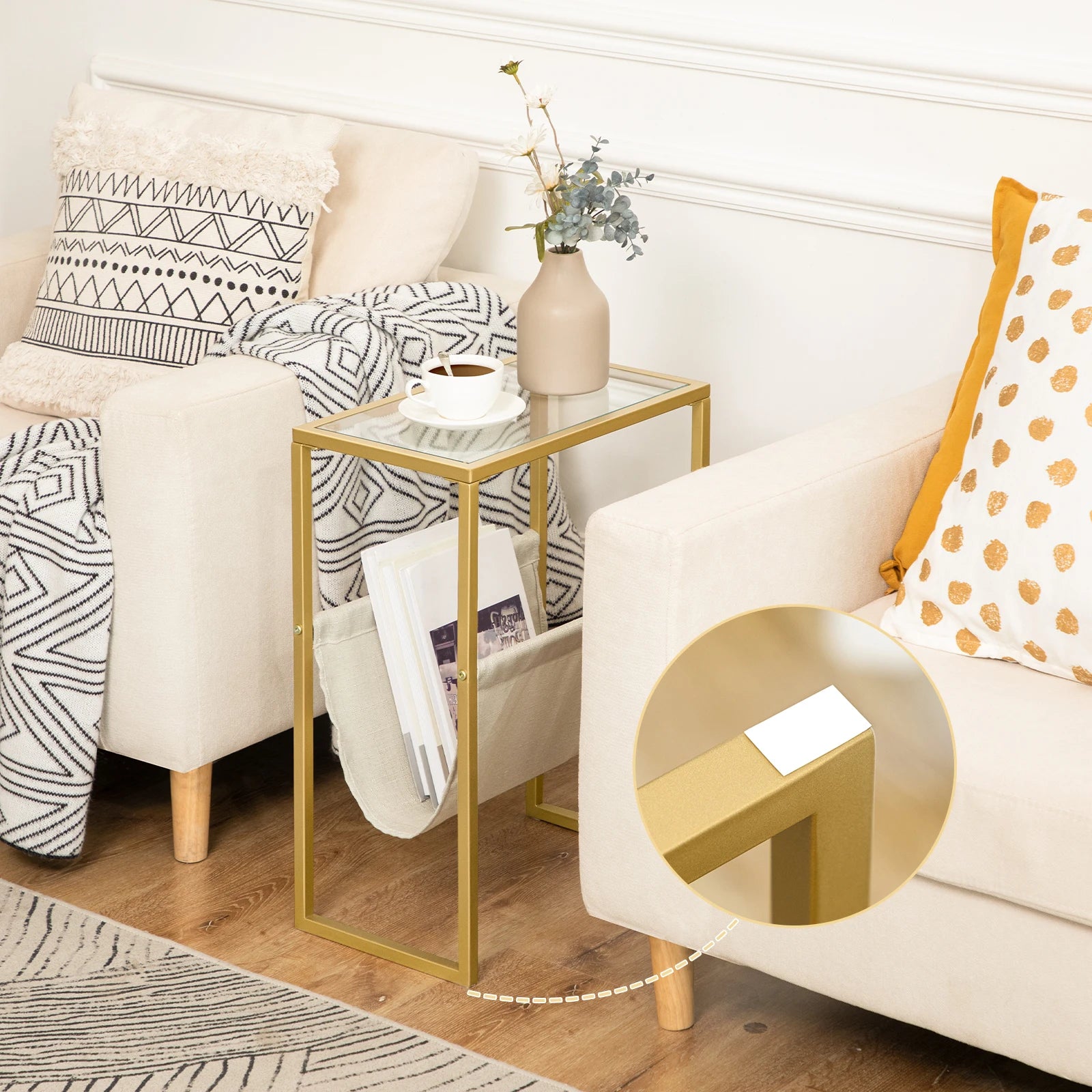 This elegant coffee table with gold metal frame is specially designed for small spaces. It can be good assistant for the family, and also a perfect supplement for the office; the top can be placed with a lamp, alarm clock, coffee snacks, etc., and the bottom magazine pocket can store magazines, books, rolled up blankets or others necessities; Placed by the sofa, next to the recliners, beside the bed, in the resting area in office... wherever it is needed, the narrow side table with the small touch of gold really pulls everything together with interior warm color pallete.