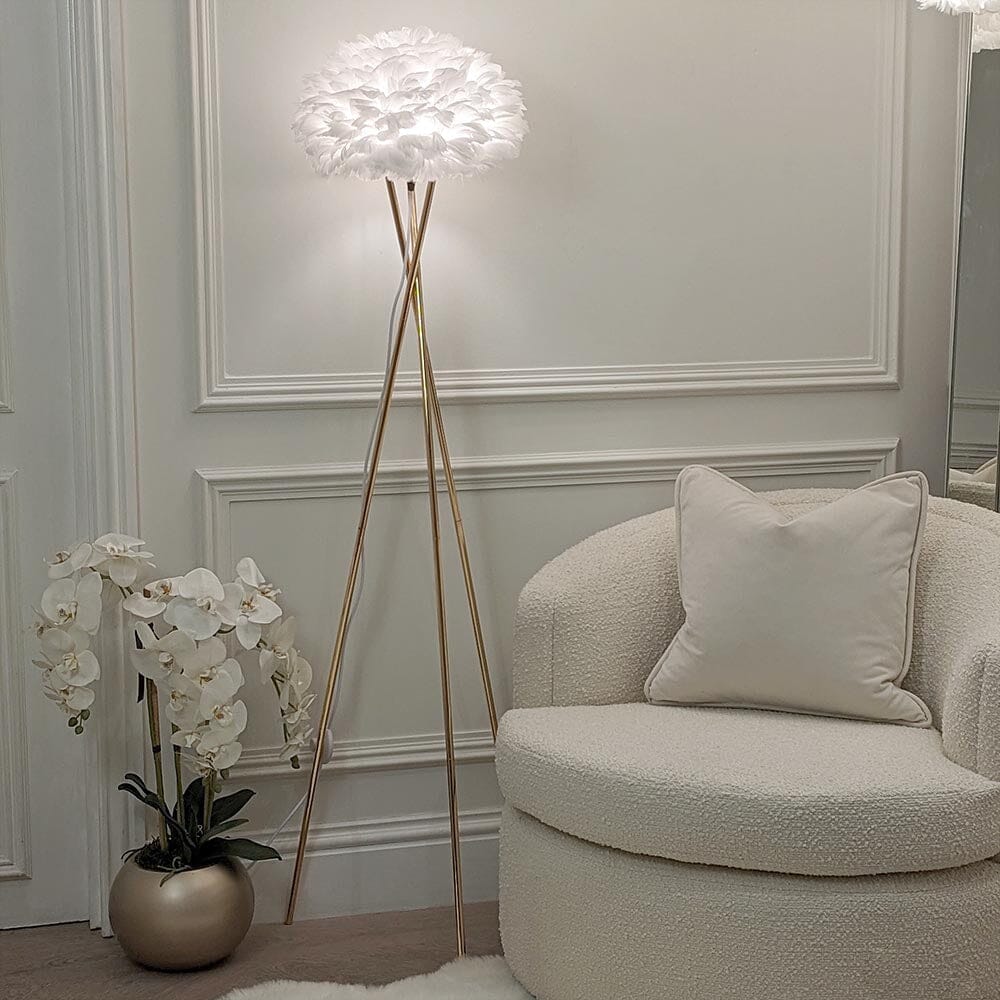 Elegantly crafted with a sleek gold tripod base and adorned with delicate feathers, this floor lamp radiates opulence and style.