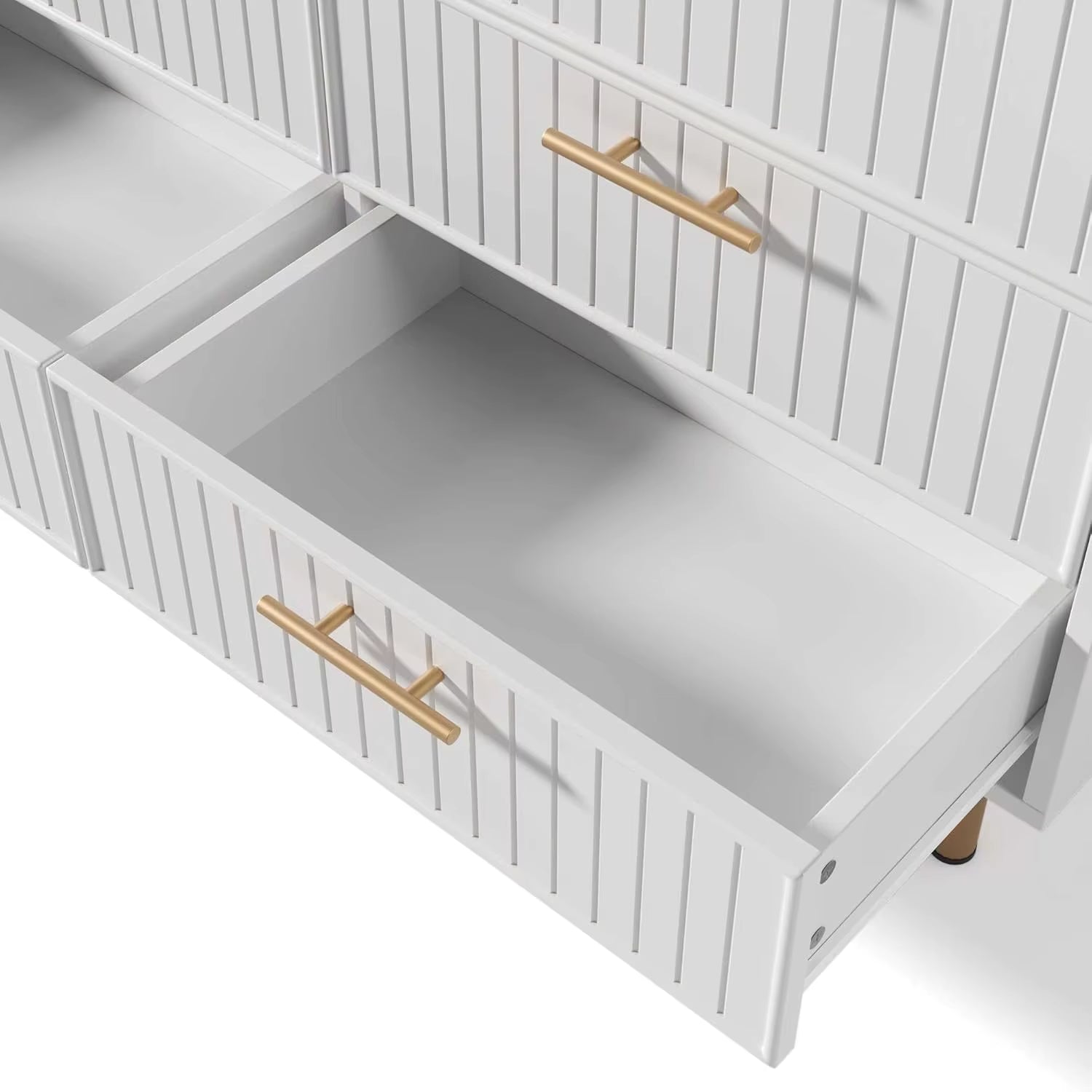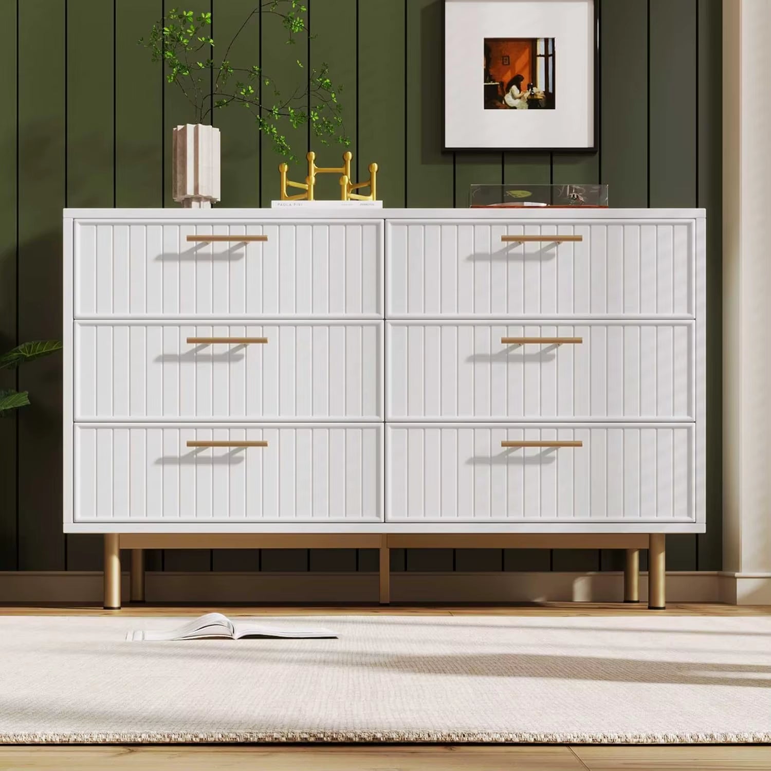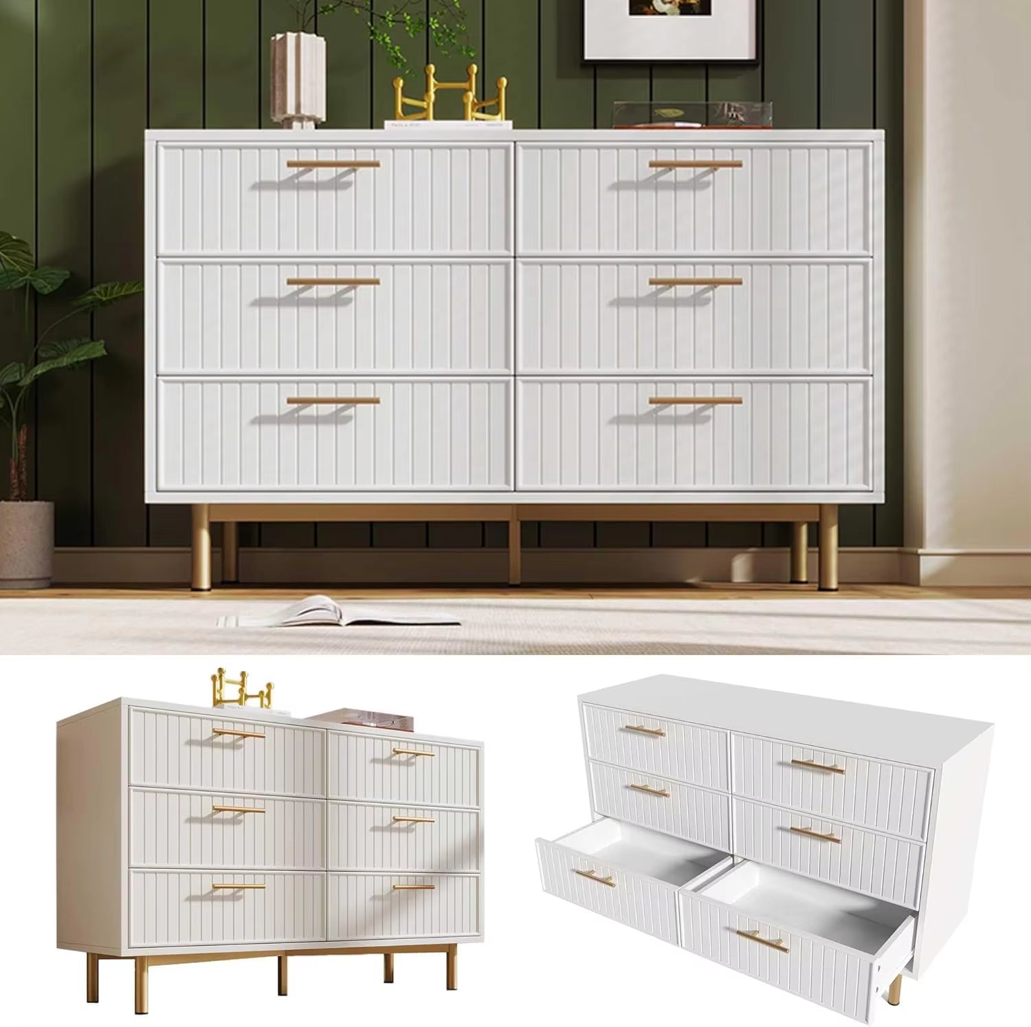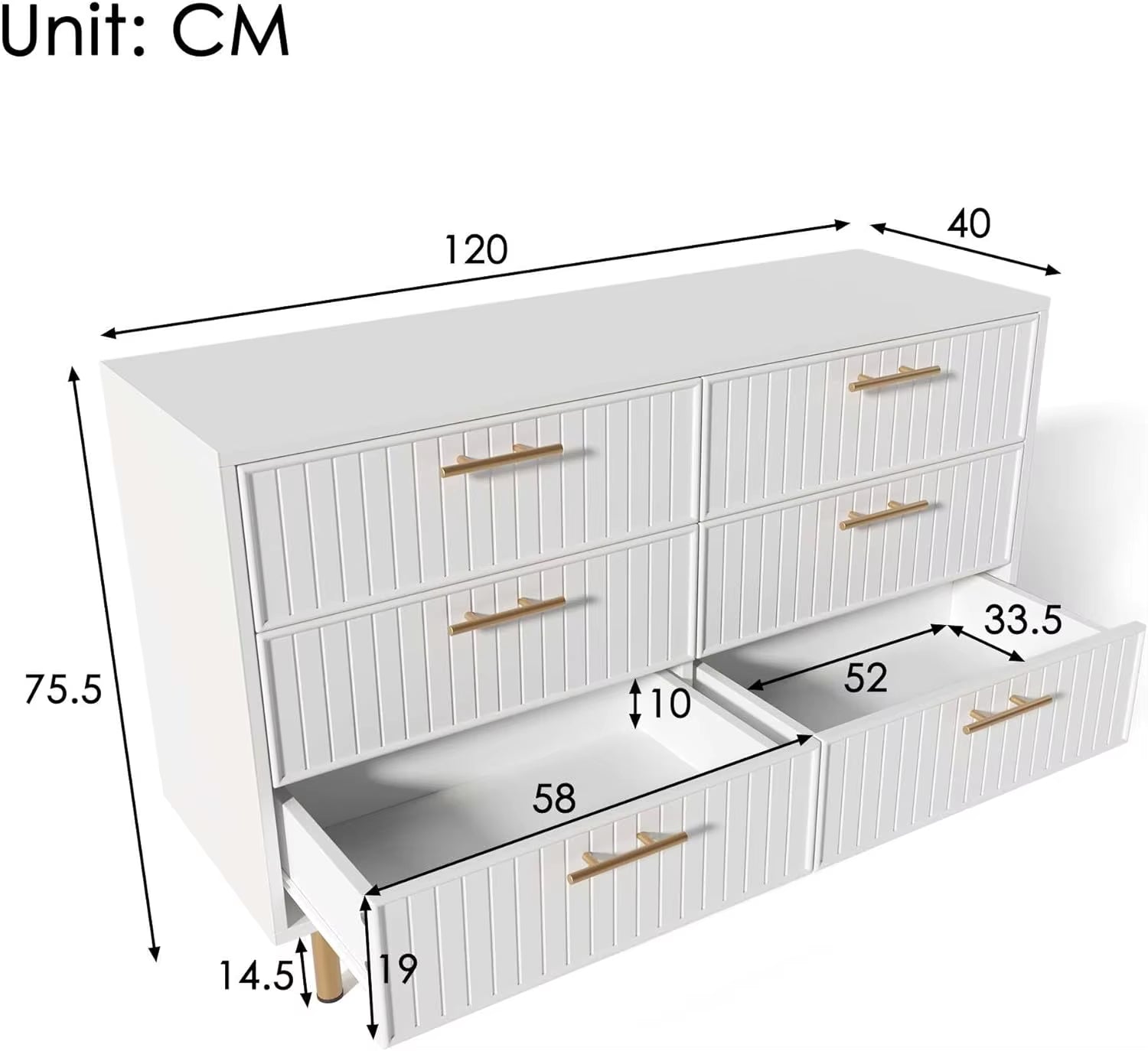 This Sideboard Cabinet with 6 Drawers in white combines modern elegance with practical storage. Its sleek design features decorative ribbing and gold handles, supported by a lightweight metal base that adds sophistication without bulk. Six spacious, equally sized drawers (52L x 33.5D x 10H cm) offer ample room to organize clothes and essentials neatly, with interiors finished in cream white for a refined touch. An adjustable middle leg ensures stability on uneven floors while protecting surfaces. Crafted from high-quality particle board and metal, this durable cabinet supports up to 45kg on top and 5kg per drawer. Delivered in two flat packs with clear instructions, assembly is straightforward and hassle-free. Dimensions: 75H x 120W x 40D cm.