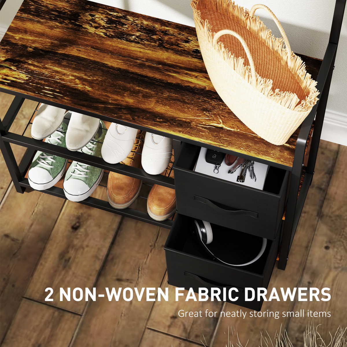 Elevate your entryway with the HOMCOM hall tree, a stylish and multifunctional solution designed to enhance your space. This versatile piece combines a coat stand, shoe rack, bench, and storage drawers into one seamless unit, providing both convenience and organization. With 15 sturdy hooks>, you can effortlessly hang your coats, bags, and accessories, while the two ample racks can accommodate up to four pairs of shoes>. The two soft fabric drawers offer additional storage for everyday essentials, keeping your space clutter-free and tidy.