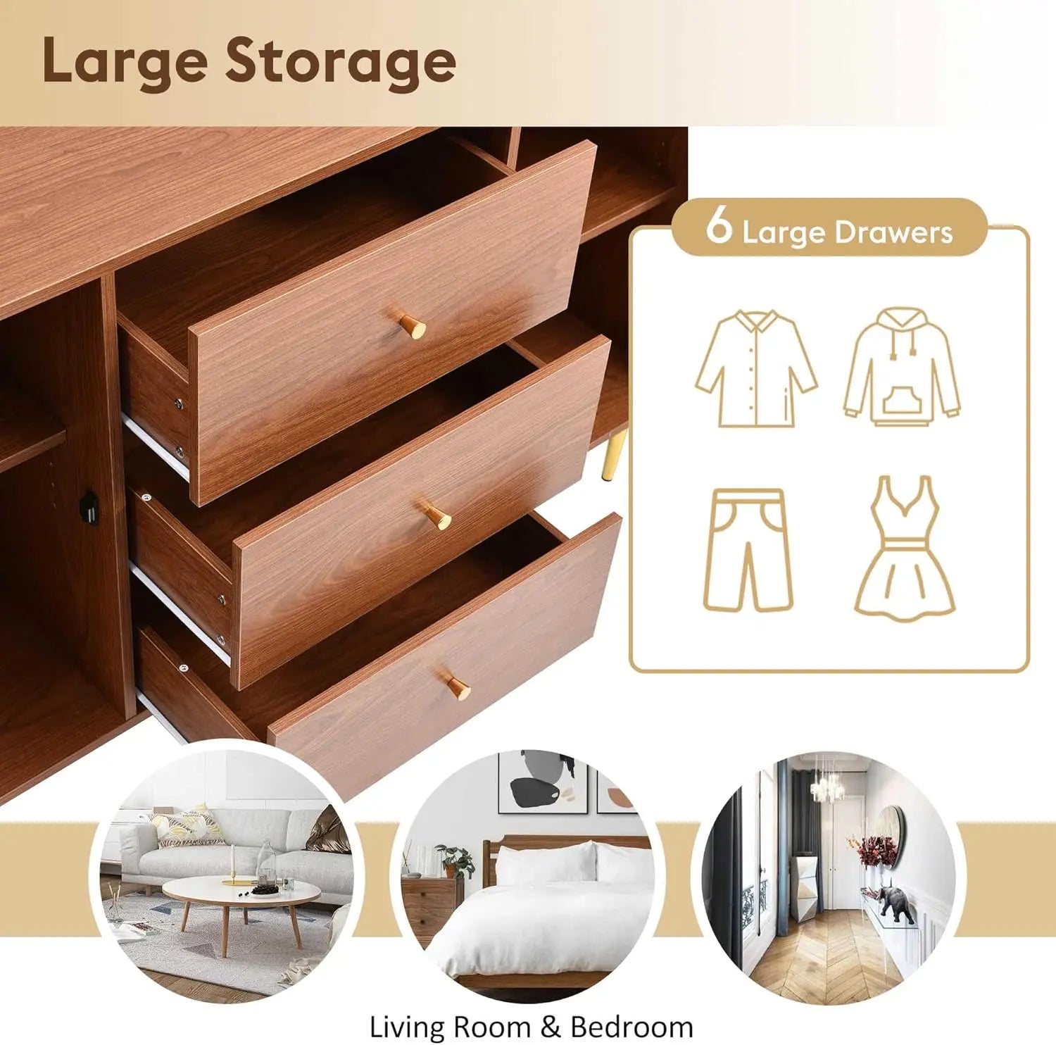Elevate your living space with this Stylish Walnut Rattan Sideboard Cabinet, designed for both beauty and functionality. Featuring three spacious central drawers and two hinged doors, it offers versatile storage options enhanced by a height-adjustable shelf with five settings in 3cm increments—perfect for organizing linen, jewelry, utensils, and more. The vintage walnut finish paired with minimalist gold-tone handles adds timeless elegance to any room. Equipped with magnetic switches, the doors open and close smoothly, extending the cabinet’s durability. Crafted from premium, odor-free materials with sturdy metal legs, it ensures lasting stability. Easy to assemble and maintain, this sideboard is ideal for your living room, hallway, bedroom, bathroom, or kitchen. Experience a perfect blend of style, convenience, and quality in one exceptional piece.