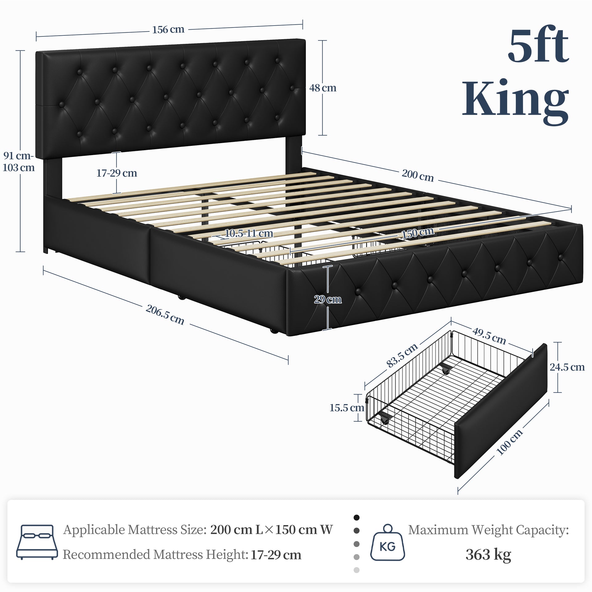 Upholstered Bed Frame with Large Pull-Out Drawers Storage & Height-Adjustable Headboard, Faux Leather