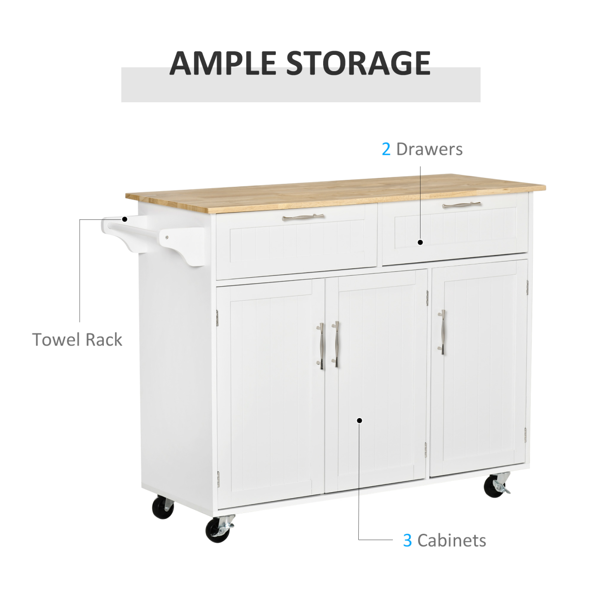 It boasts ample storage solutions, including two smooth-gliding drawers and three spacious cabinets, perfect for organizing your tableware, glassware, pots, pans, and cutlery. A convenient towel hanging rail adds to its practicality, while the sturdy wood countertop offers an ideal surface for meal preparation.