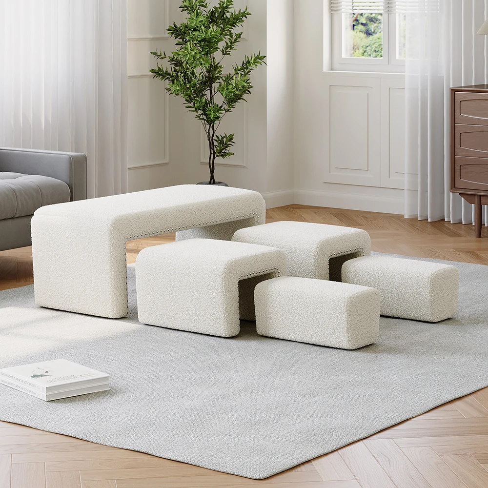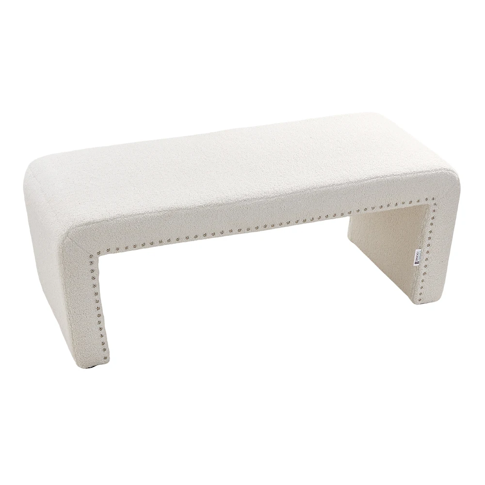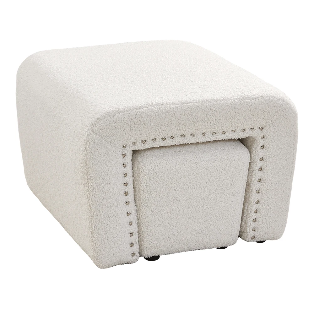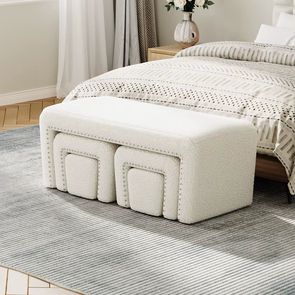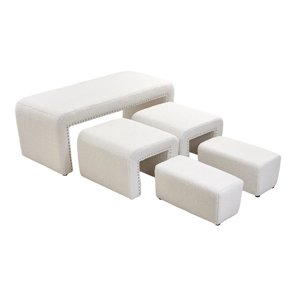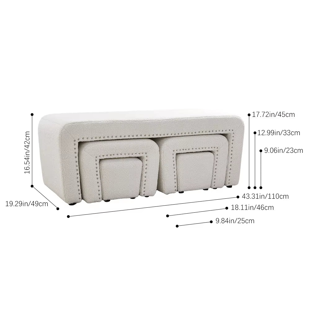 Designed to blend seamlessly with contemporary interiors, these pieces offer both style and functionality. This set includes one large upholstered bench and four nesting ottomans, making it perfect for lounging or as an extra seating option. Luxurious teddy fur upholstery offers unparalleled comfort while elevating the overall sophistication of the space. The nailhead trim adds a classic touch, enhancing the overall aesthetic appeal. Whether placed in your living room, bedroom, or entrance, these pieces will effortlessly enhance your home decor.