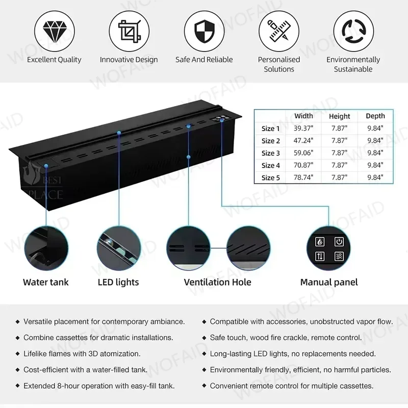 Water vapor fireplace supports indoor humidification function, adding aromatherapy or few of disinfectant into the water to make air freshness and disinfection in our living space.