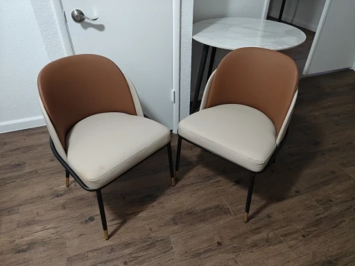 These dining chairs with unparalleled detail and stylish two tones design. From the breathable microfiber silicone leather to the carefully crafted metal legs, and curved backrest. every aspect has been thoughtfully considered. They will elevate your dining room to a whole new level, perfectly paired with our upscale dining tables