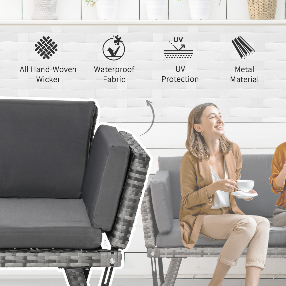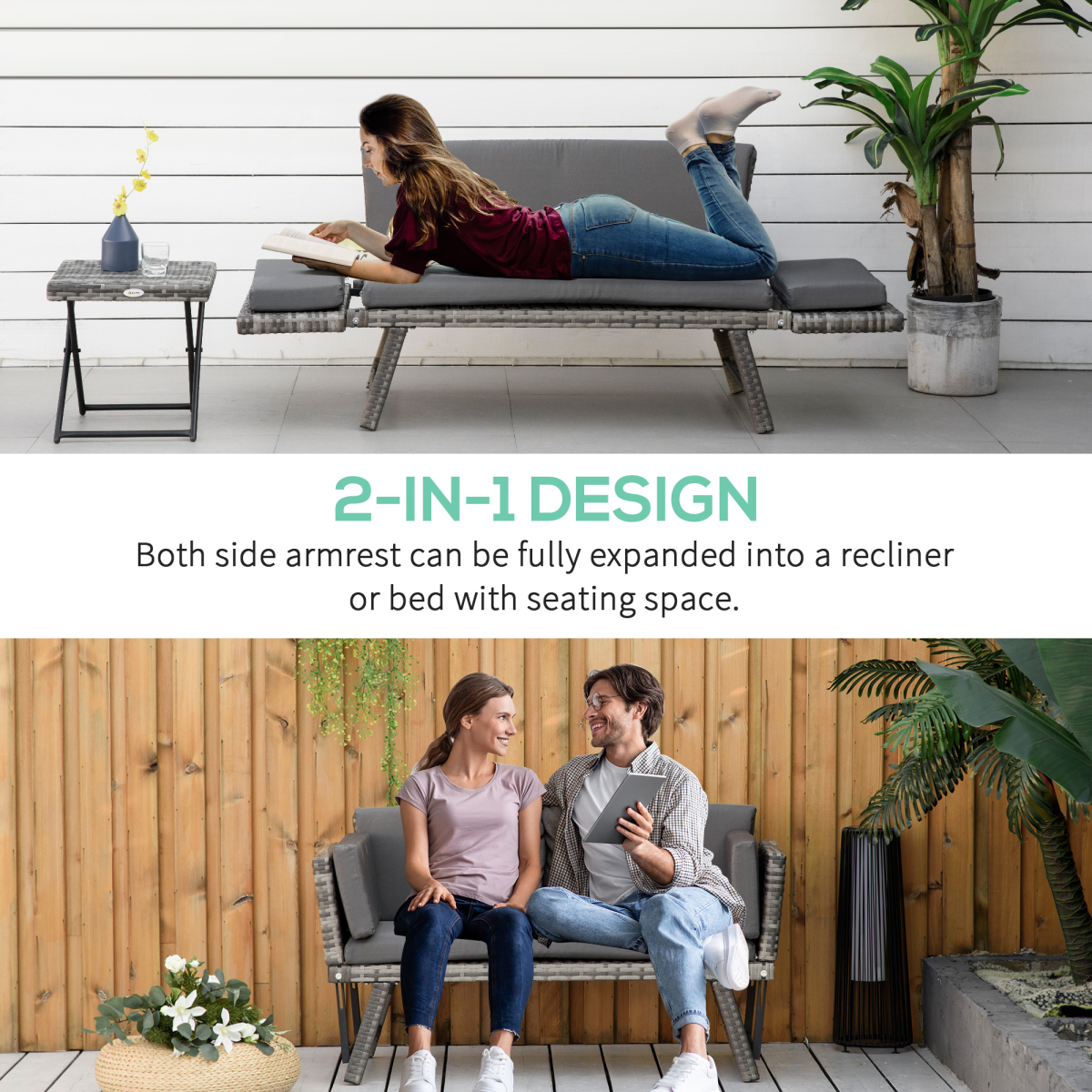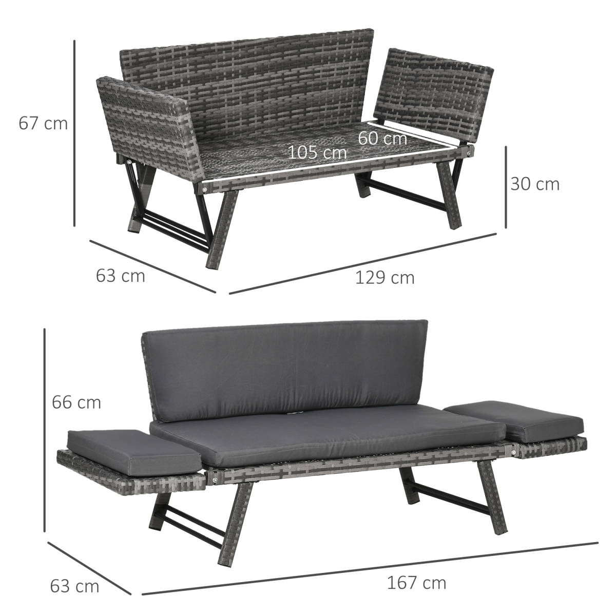 Experience outdoor lounging redefined with this versatile 2-in-1 rattan folding daybed. It easily converts from a two-seater outdoor sofa into a bed by folding down the arms, giving you flexible seating and sleeping options in one stylish piece. The durable metal frame is wrapped in PE wicker for enhanced strength and weather resistance, while thick cushions provide sinking-in comfort. A stable four-leg base ensures balanced support whether you’re sitting or sleeping. Easy to clean—simply wipe with mild sanitizer and a damp cloth. Maximum load: 220 kg. Assembly is required.