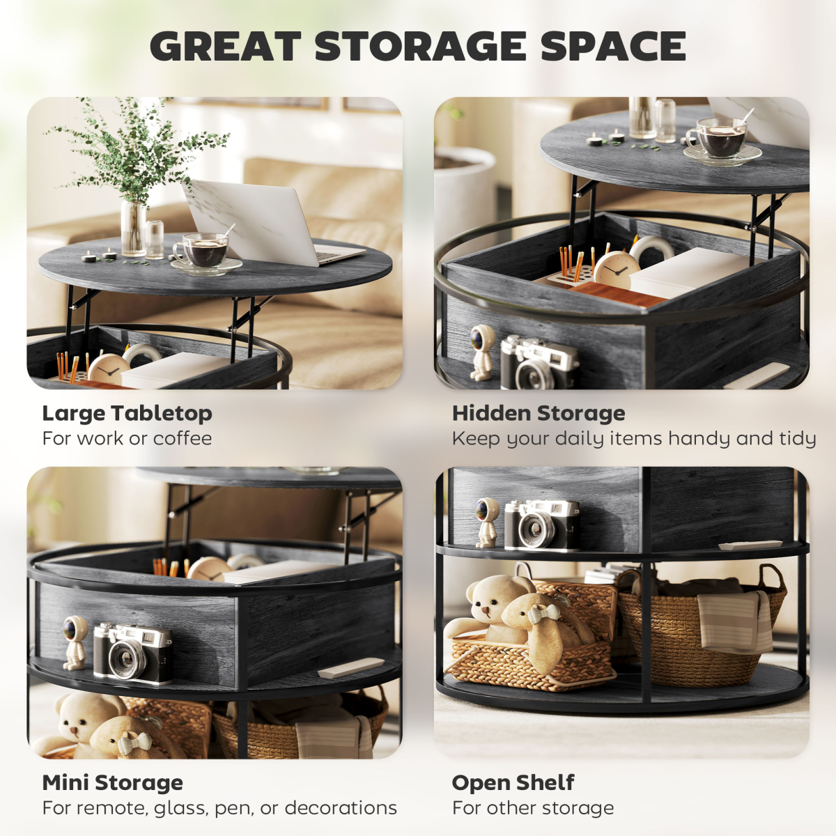 Enhance your living space with our elegant Rattan Coffee Table. Featuring a sleek lift-top design, this multifunctional piece is perfect for dining, working, or relaxing at home. With hidden and open storage compartments, everything essential will be organized and within reach. Its stylish charcoal grey finish complements any decor while ensuring safety with round, smooth edges. Crafted from durable particle board and a sturdy powder-coated steel frame, this table will stand the test of time. Enjoy the perfect blend of functionality and modern design in your home.