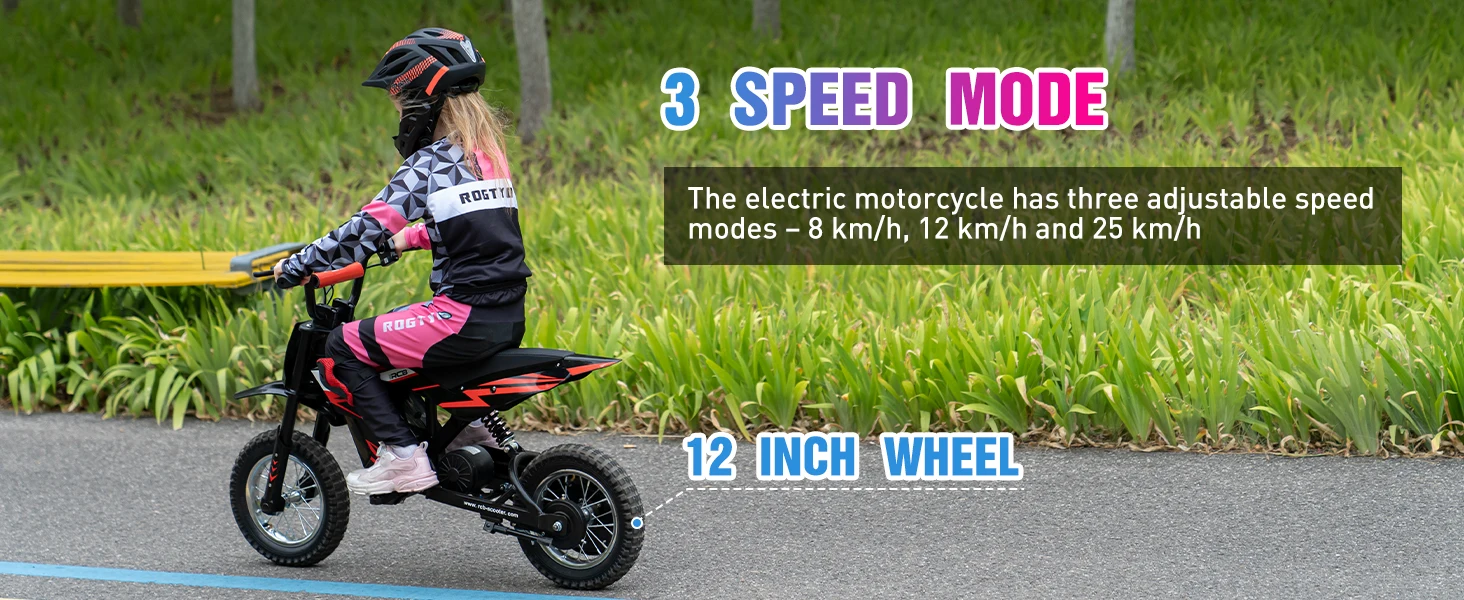 3-speed adjustment: Electric motorblike design 5/7.5/15.5 MPH to meet the speed requirements of different scenarios. Suitale for kids aged 3-12, this Electric Ride On for Kids comes with a powerful motor allows it to reach a top speed of 15.5 MPH (25KM/H), (Data may vary depending on factors like speed mode, weight load, battery, temperature, road conditions, etc.)