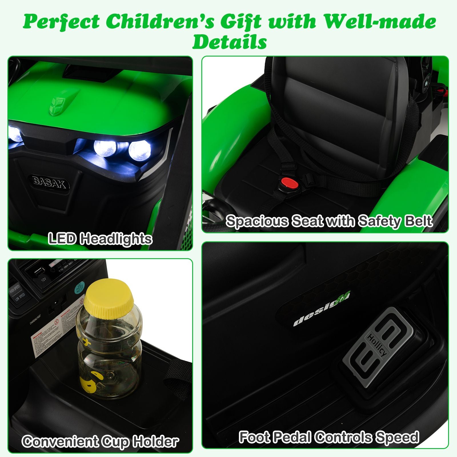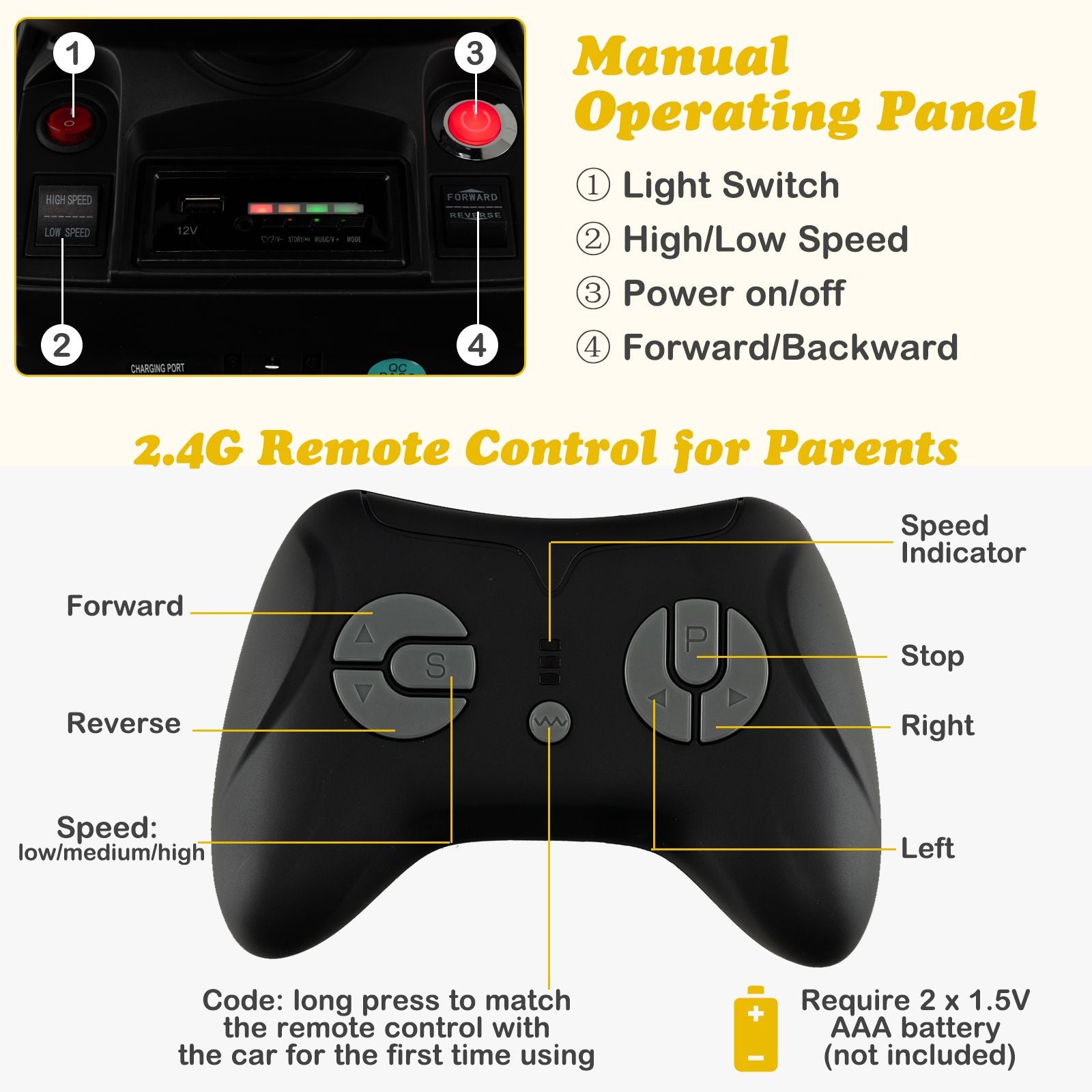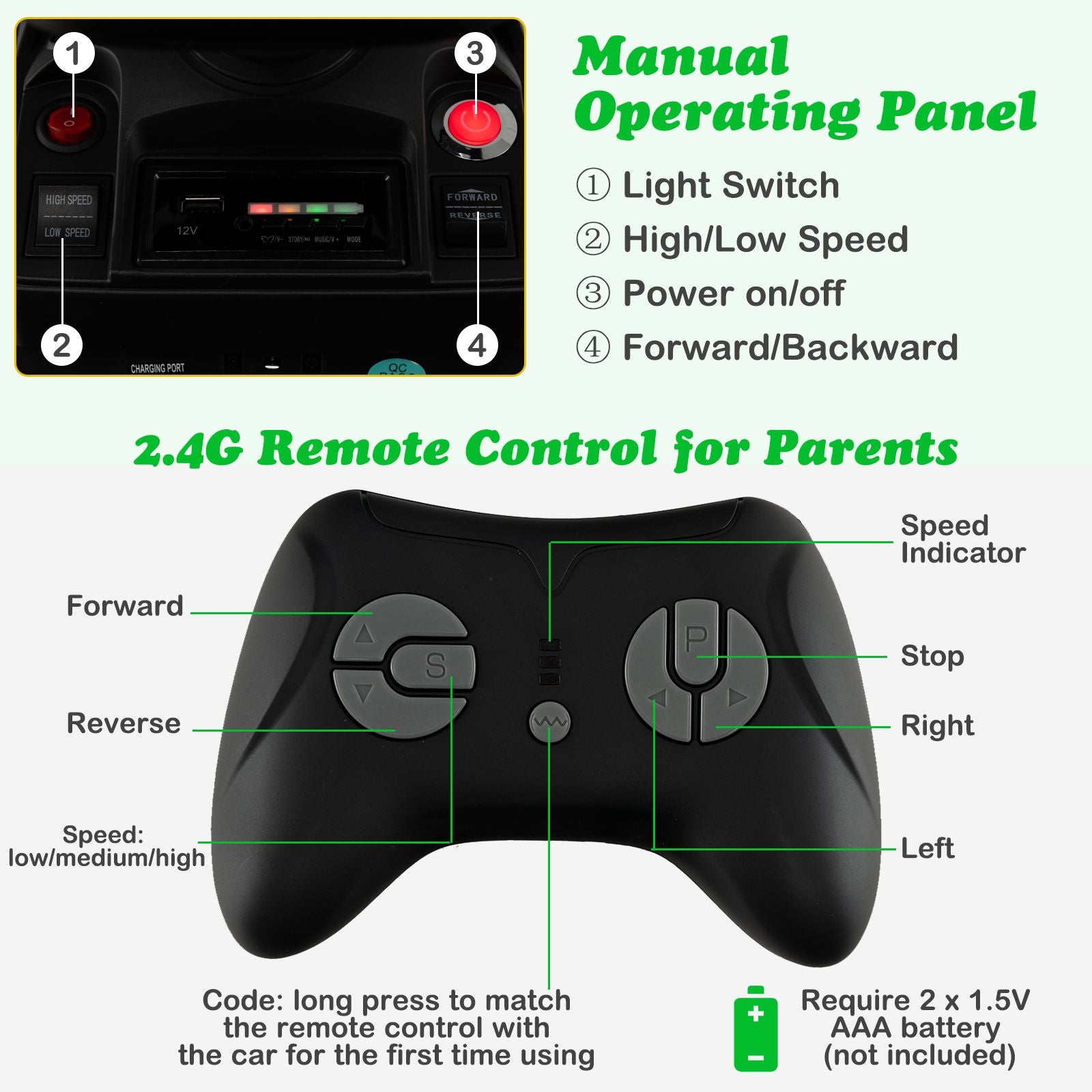 2 Driving Modes with RC: Children can control this ride on tractor through the steering wheel and the accelerator pedal. Additionally, parents can operate the electric ride on car with the 2.4G remote control that requires 2 x 1.5V AAA battery (not included).