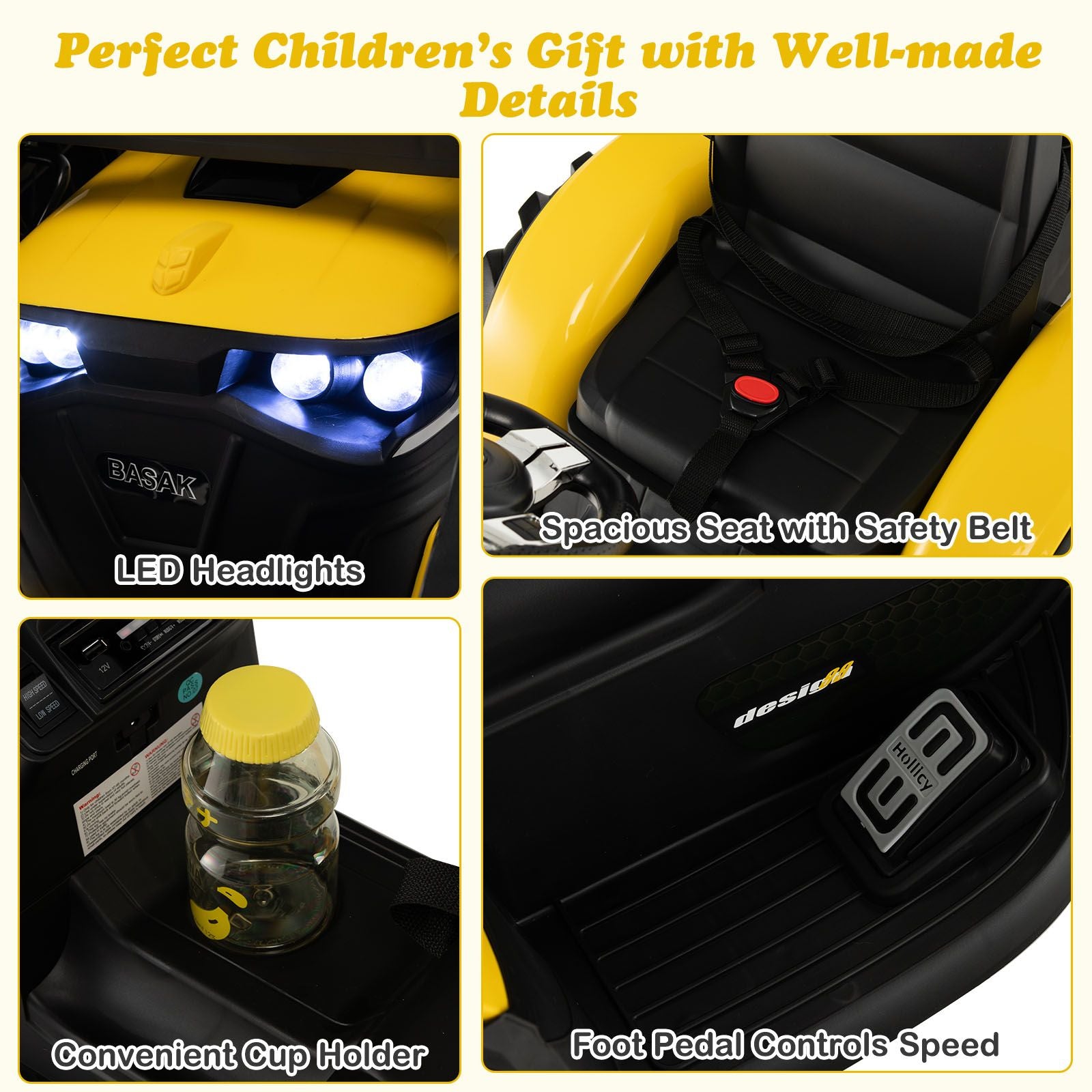 This 3 in 1 kids ride on tractor comes with a shovel bucket, digging bucket and a trailer that can be detached and combined freely. There are 2 control ways to operate this electric excavator: the steering wheel and foot pedal for children, and the remote control for parents. And the seat belt also provides maximum safety for kids. While driving, the MP3 and USB ports let children play audio files to have more fun. If you are looking for such a product, do not hesitate to buy it!
