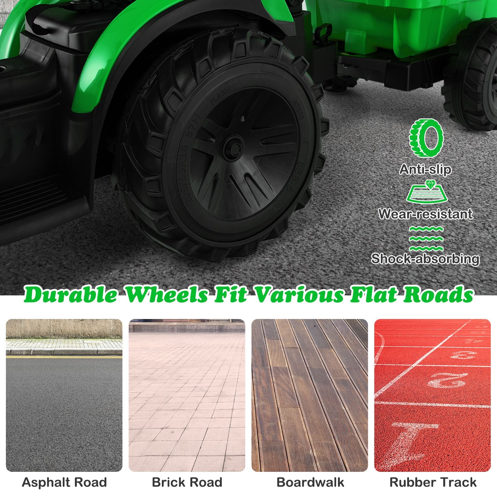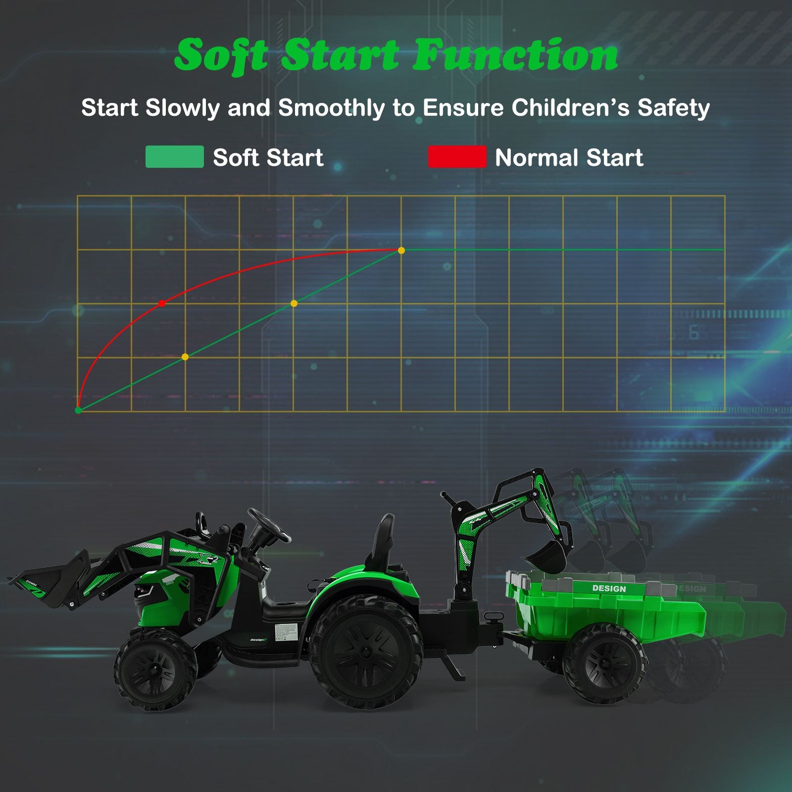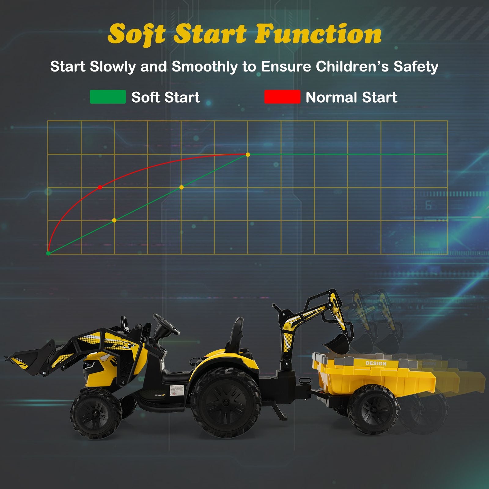 Durable and Safety Designs: Equipped with 6 non-slip, shock-absorbing and wear-resistant wheels that are made of PP and EVA, this electric excavator with trailer is suitable for different flat roads, such as the asphalt road, brick road, boardwalk, etc. Also, the soft start function and seat with safety belt ensure great safe drive.