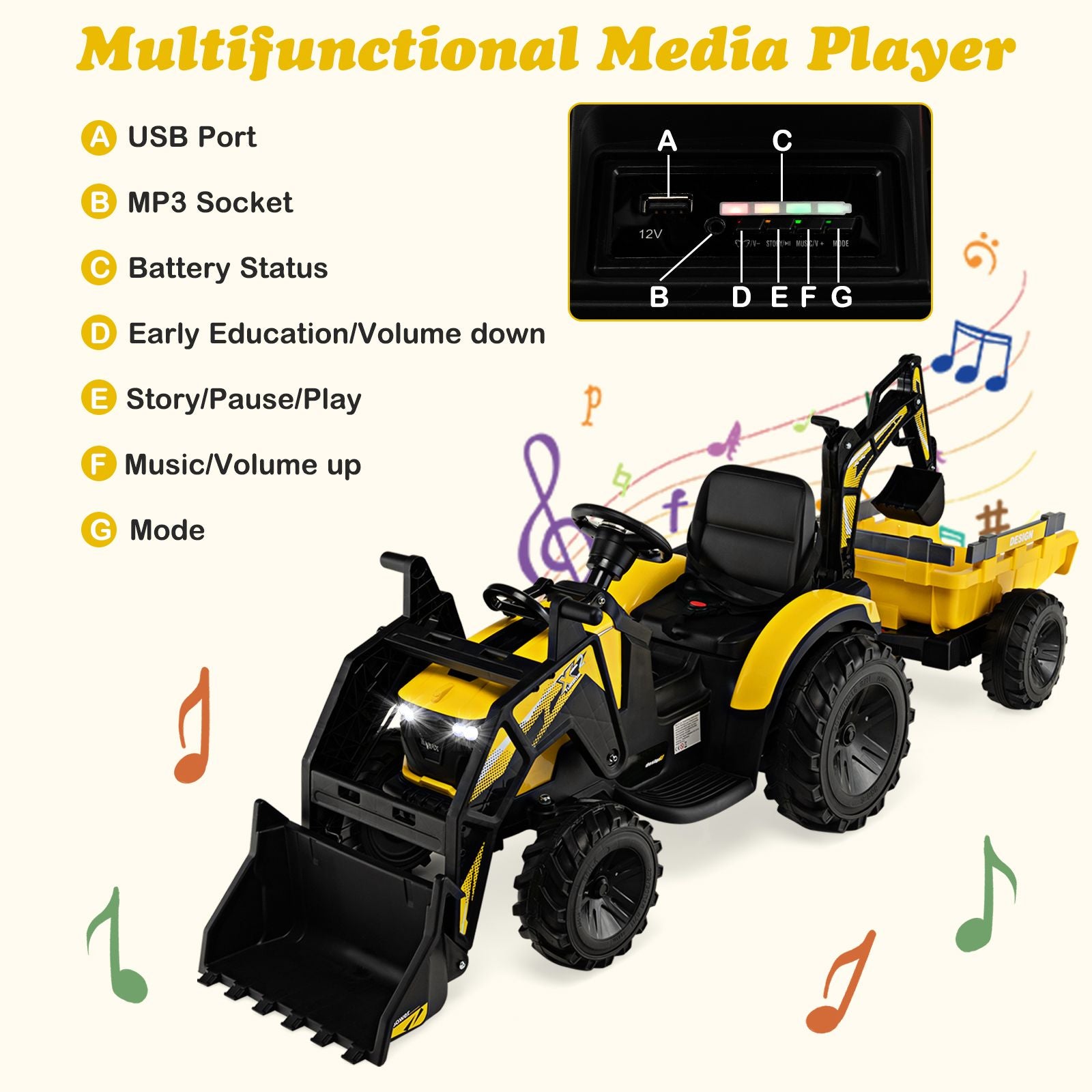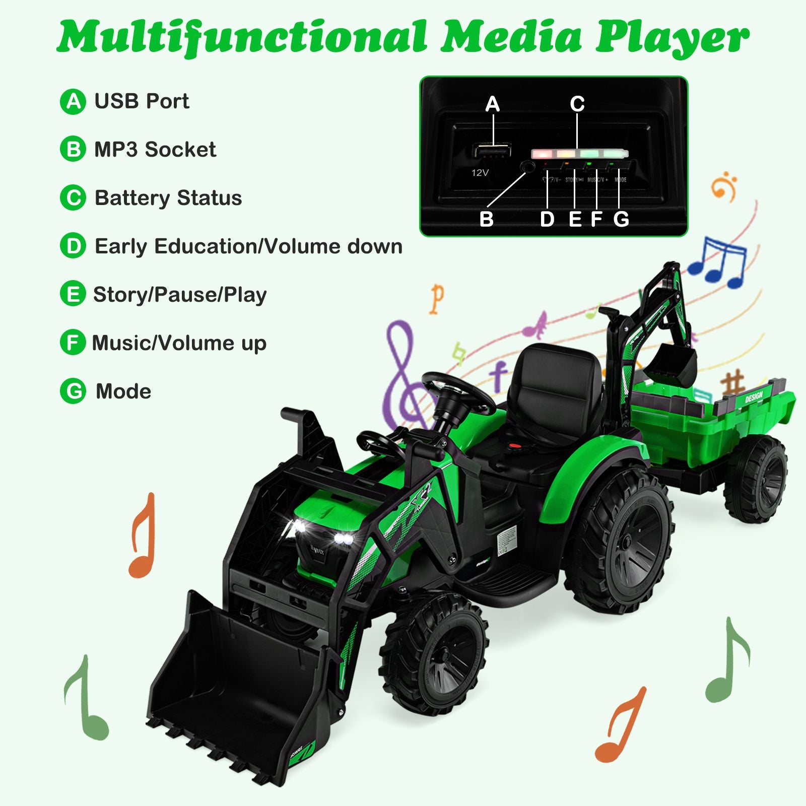 Music Function Adds More Fun: The multifunctional music player on the manual operating panel features the remaining power display, play/pause function, mode selection and volume adjustment. The USB port and MP3 socket allow children to enjoy their favorite songs or stories, and buttons on the steering wheel can make the music and horn.