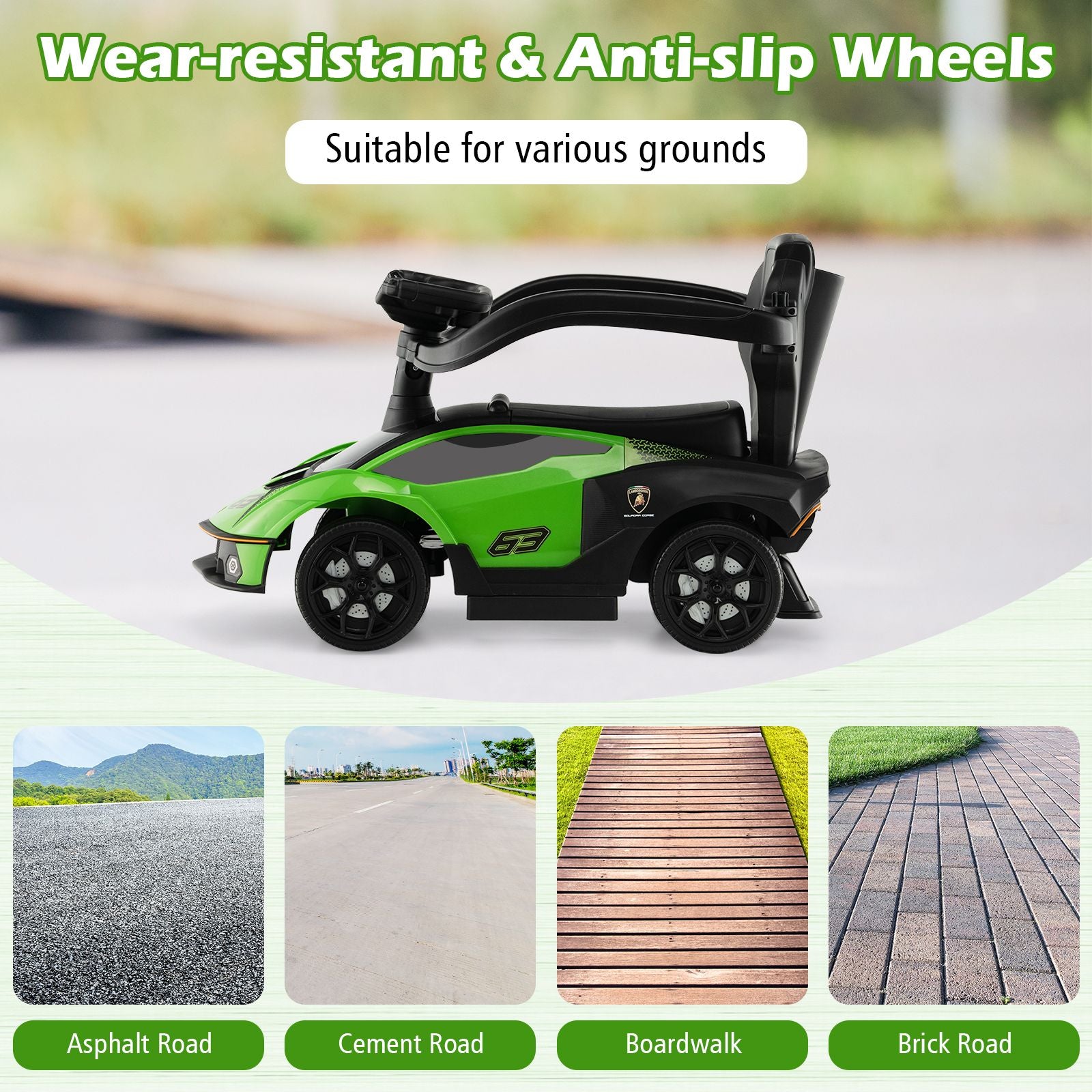 Introducing the Kids Licensed Lamborghini Ride on Car with Push Handle, a versatile and exciting 3-in-1 toy designed to accompany your child's growth and development. This innovative product can be easily transformed into a walking car, ride-on car, or stroller, making it a perfect choice for children aged 12 to 36 months. The foot-to-floor sliding mechanism not only provides endless fun but also aids in developing essential motor skills and body coordination. Parents can enjoy the convenience of the easy-to-grip push handle, allowing them to assist younger children as they explore their surroundings safely. With its stylish Lamborghini design, this ride-on car is sure to capture your child's imagination while providing a delightful riding experience in parks or around the neighborhood.